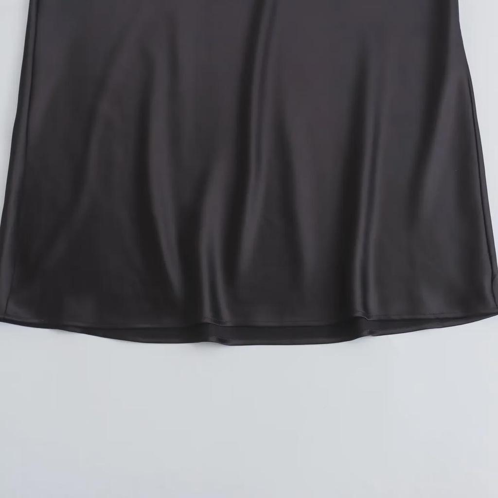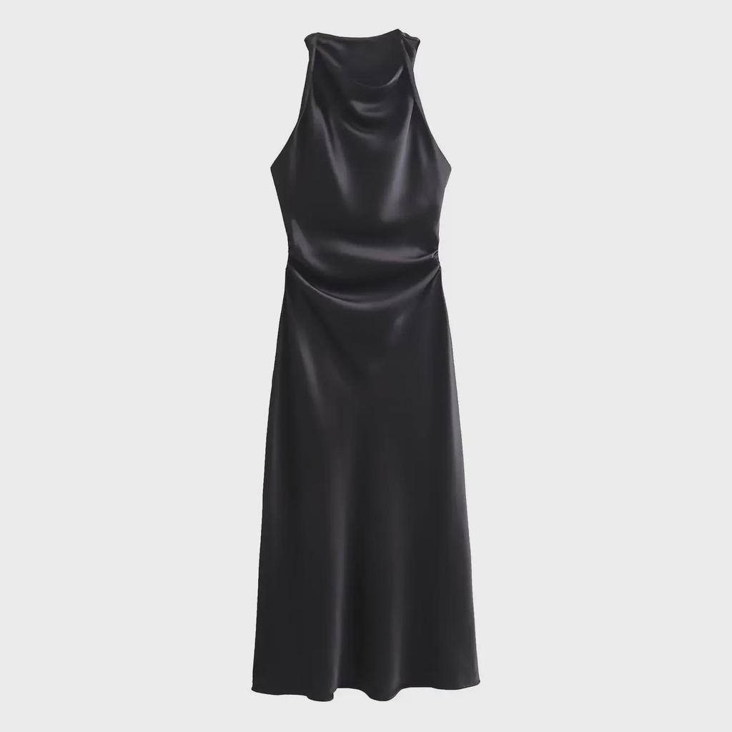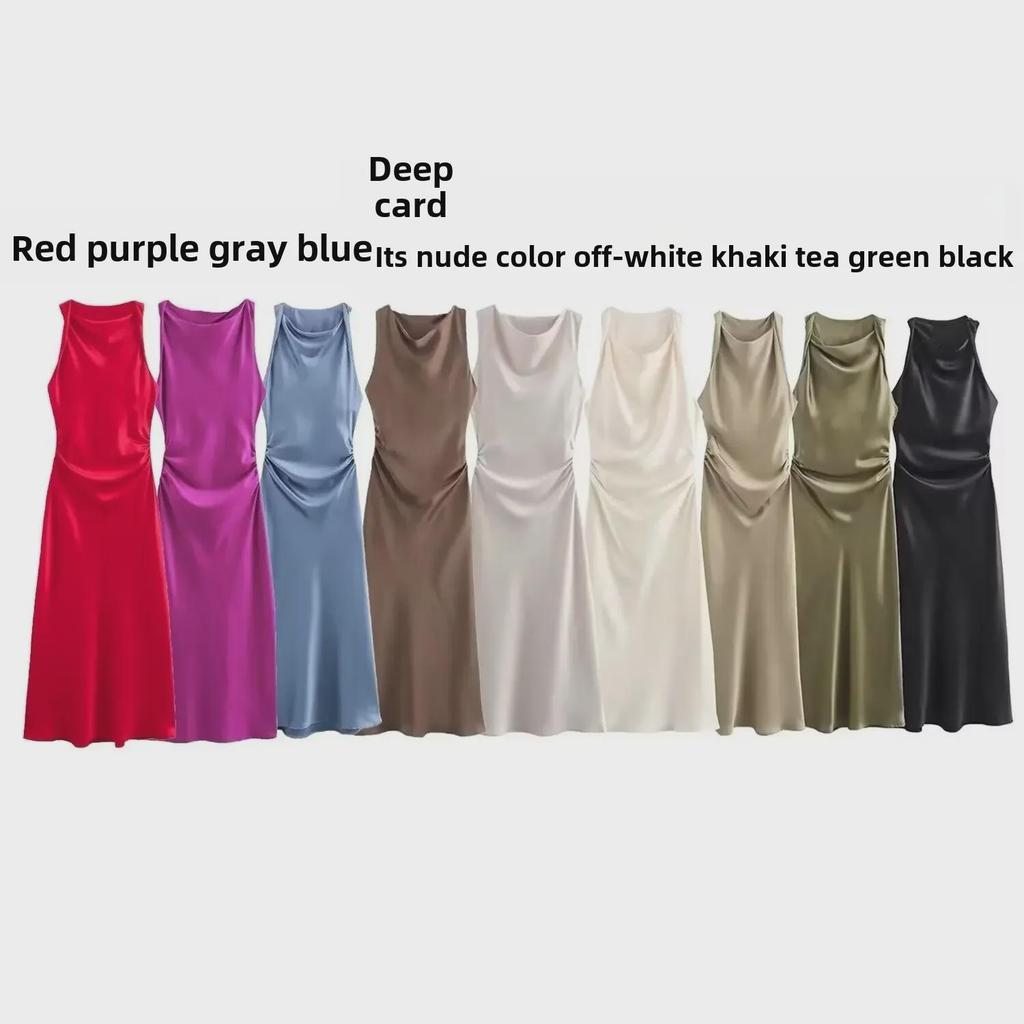 Платье миди из черного шелкового атласа с текстурой 2024 года — европейский и американский стиль, без рукавов, облегающий крой, легкий зрелый образ на весну и лето