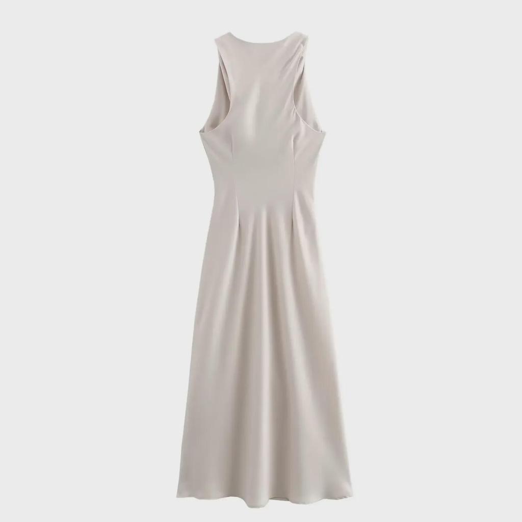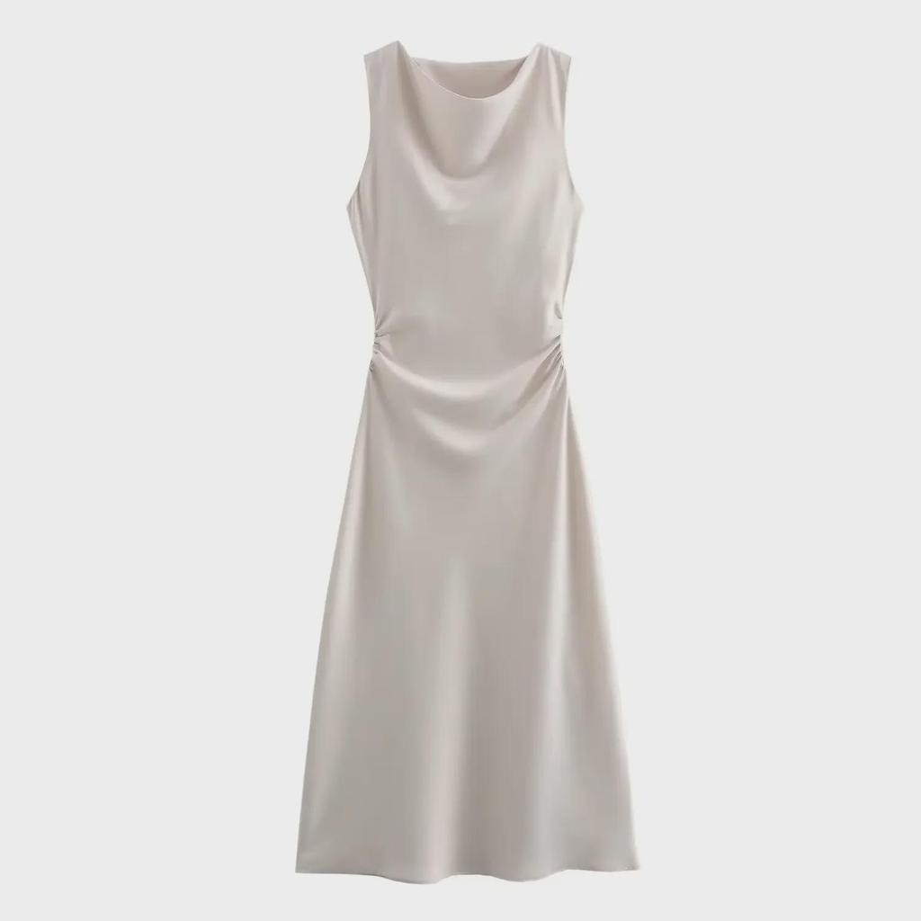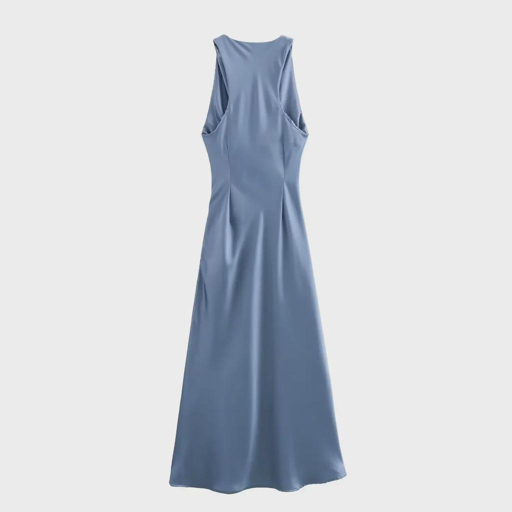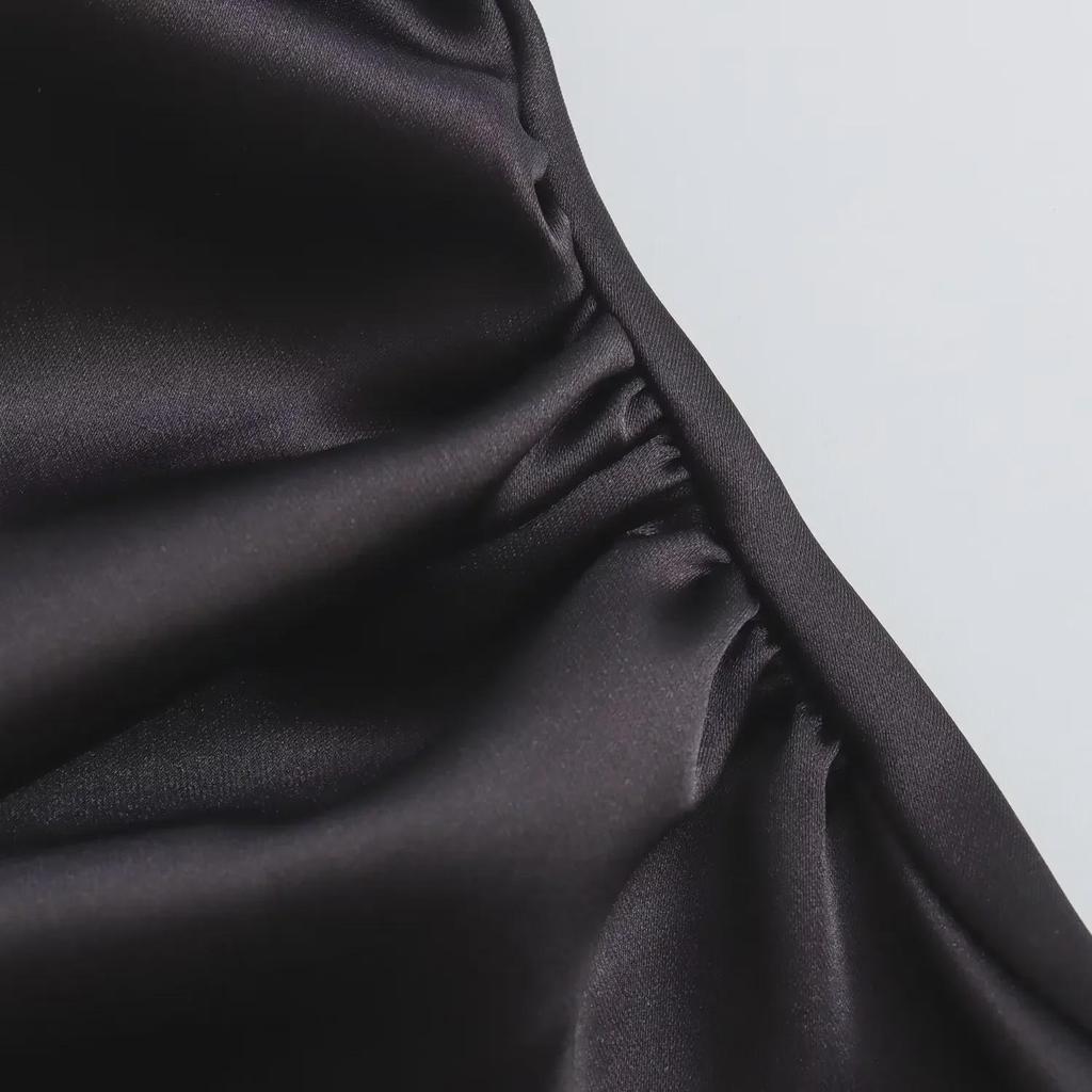 Платье миди из черного шелкового атласа с текстурой 2024 года — европейский и американский стиль, без рукавов, облегающий крой, легкий зрелый образ на весну и лето