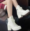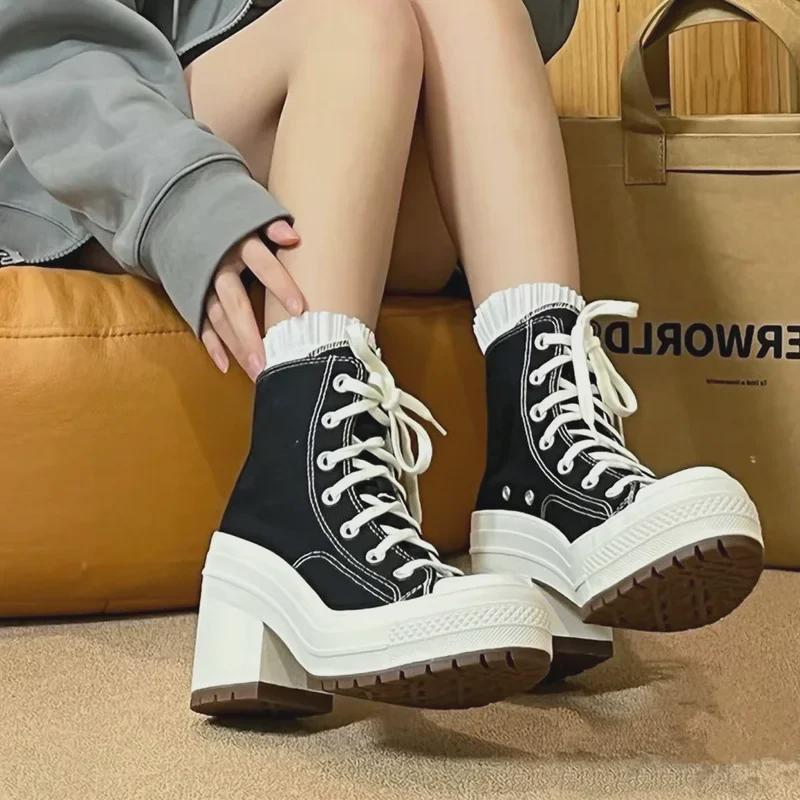 Женские парусиновые туфли на высоком каблуке в стиле ретро 2024 года: Белые, на толстом каблуке, с высоким голенищем, круглым носком, тонкими ремешками и водонепроницаемой платформой.