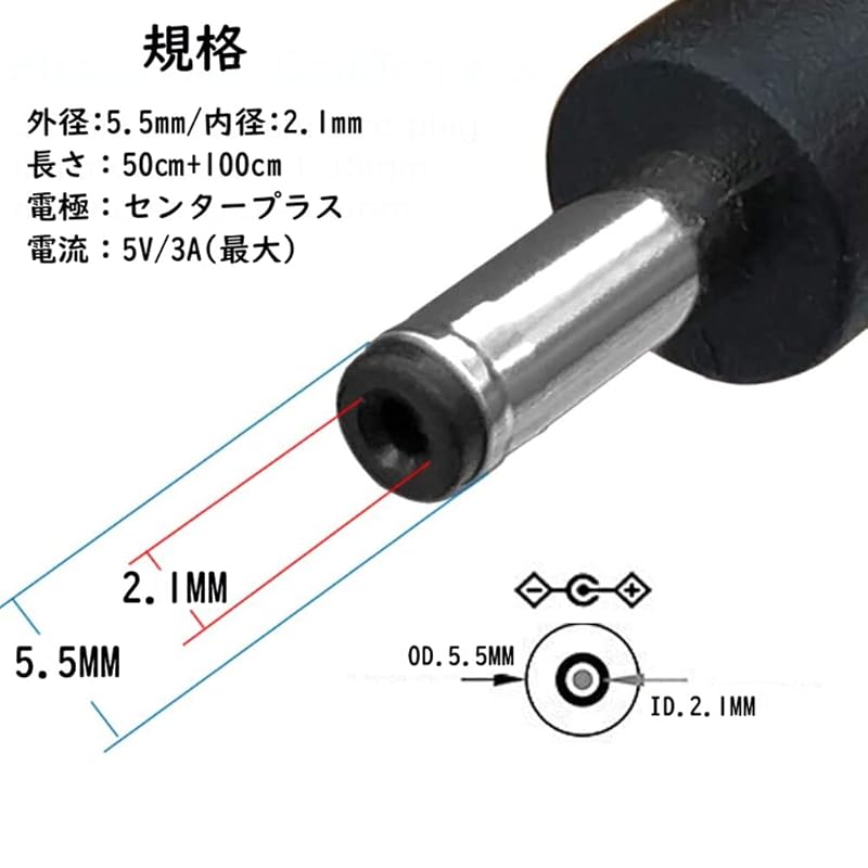 [Характеристики продукта] Стандарт: USB (К) к разъему постоянного тока; Внешний диаметр вилки постоянного тока: 5,5 мм/внутренний диаметр: 2.1mm; длина: 30см + 100см; электрод: центр положительный; текущий: 5В/3А (максимум) *Данные не могут быть переданы. Спасибо за понимание.