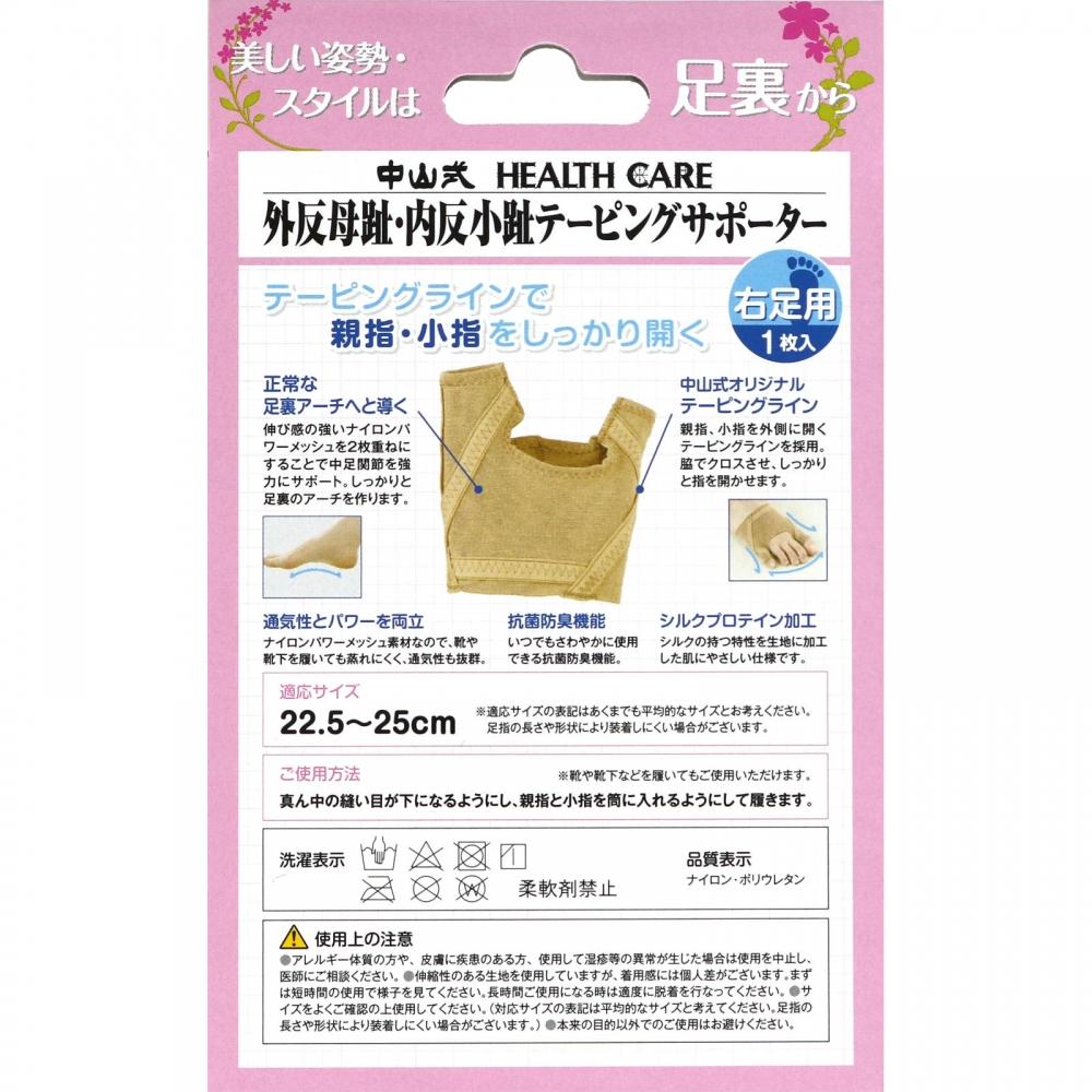 Поддерживающий бандаж Nakayama Shiki Anti-Hallux Valgus / Broons Taping Support для правой стопы разработан для раскрытия большого и малого пальцев стопы наружу с использованием уникальной техники тейпирования.. Поддерживающее приспособление эффективно помогает в решении проблем вальгусной деформации большого пальца стопы и косточки на ноге, фиксируя пальцы ног в оптимальном положении.. Материал изготовлен на основе протеина шелка, приятного для кожи, обладает антибактериальными и устойчивыми к запахам свойствами, обеспечивая свежесть и комфорт во время использования.. В этот набор входит одна деталь специально для правой ноги.