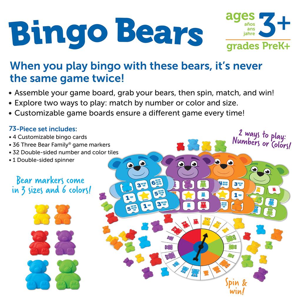 «Bingo Bears» от Learning Resources, компании, любимой в более чем 100 странах мира, — это обучающая игрушка, в которую могут играть дети от 3 лет. Она позволяет детям изучать цифры, цвета и размеры, весело играя с разноцветными медведями.