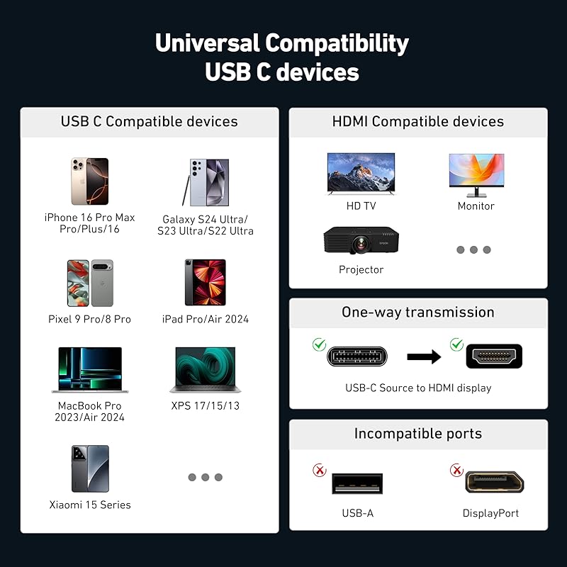 ✅[Широкая совместимость]: BENFEI USB-C на HDMI совместим с iPhone 15/16 Pro/Max, 13"/15" MacBook Pro/Air, iMac, 2023, 2022, 2021, 2020, 2019, Google Chromebook Pixel, Yoga 900, Dell XPS 13 (9350), Dell XPS 15 9550, Dell XPS12 9250, DellPrecision 5510, HP Specter X2, HP Specter x360, HP Elitebook Folio G1, HP Elite x2 1012 G1, Acer Switch Alpha 1, Acer Spin 7, Acer Chromebook R13, Samsung Chromebook Plus, Samsung Galaxy TabPro S, Samsung Galaxy, совместимый с A7 2017, LG G5, LG V20, HTC 10.
