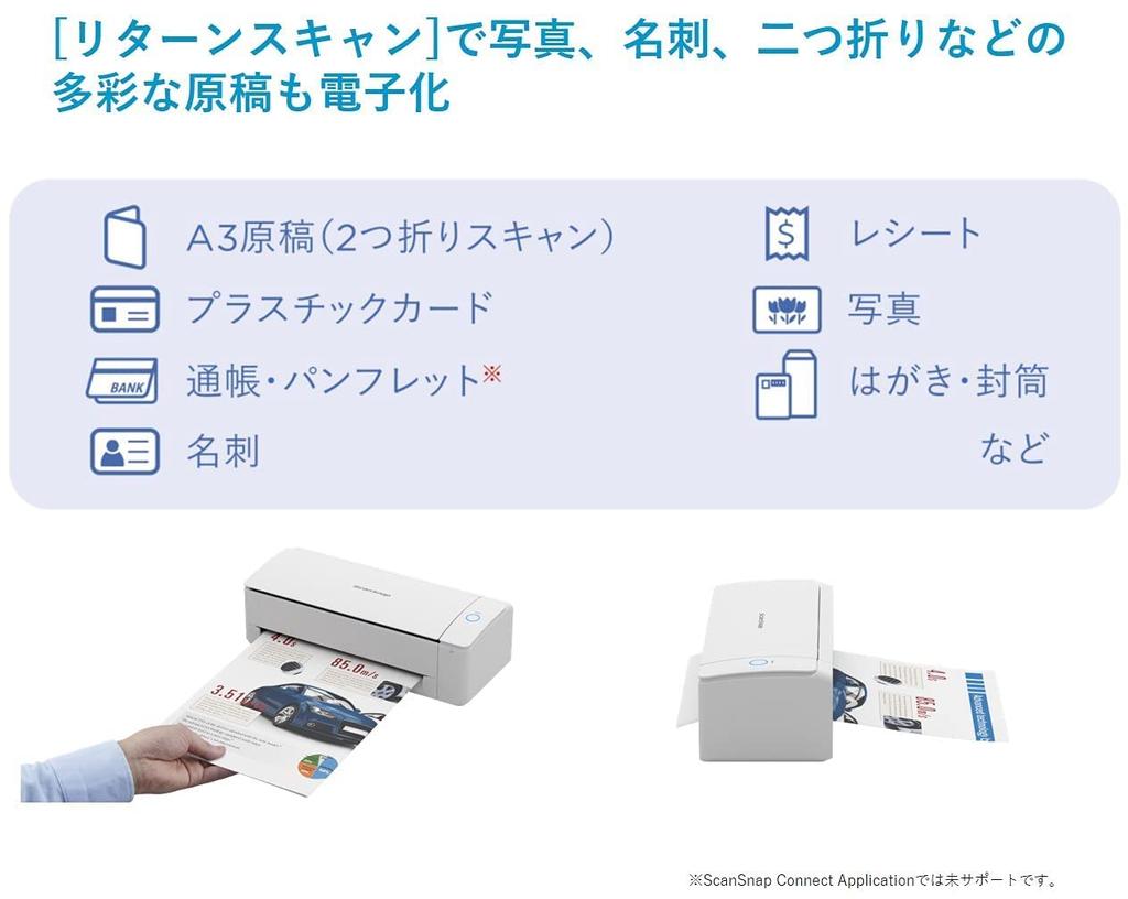 «Обратное сканирование», при котором документы подаются с передней стороны сканера, сканирует различные документы толщиной до 2 мм, такие как фотографии, визитные карточки и пластиковые карты.. Поддерживает одновременное чтение с обеих сторон и может считывать формат А4 за 5 секунд.. Вы можете сканировать даже при закрытой крышке, и отсканированный документ будет возвращен той же стороной, которой вы его вложили, что идеально подходит для случаев, когда вам нужно быстро отсканировать несколько визитных карточек и т. д.
