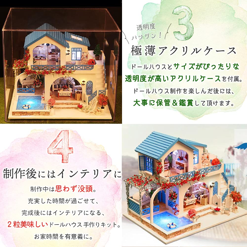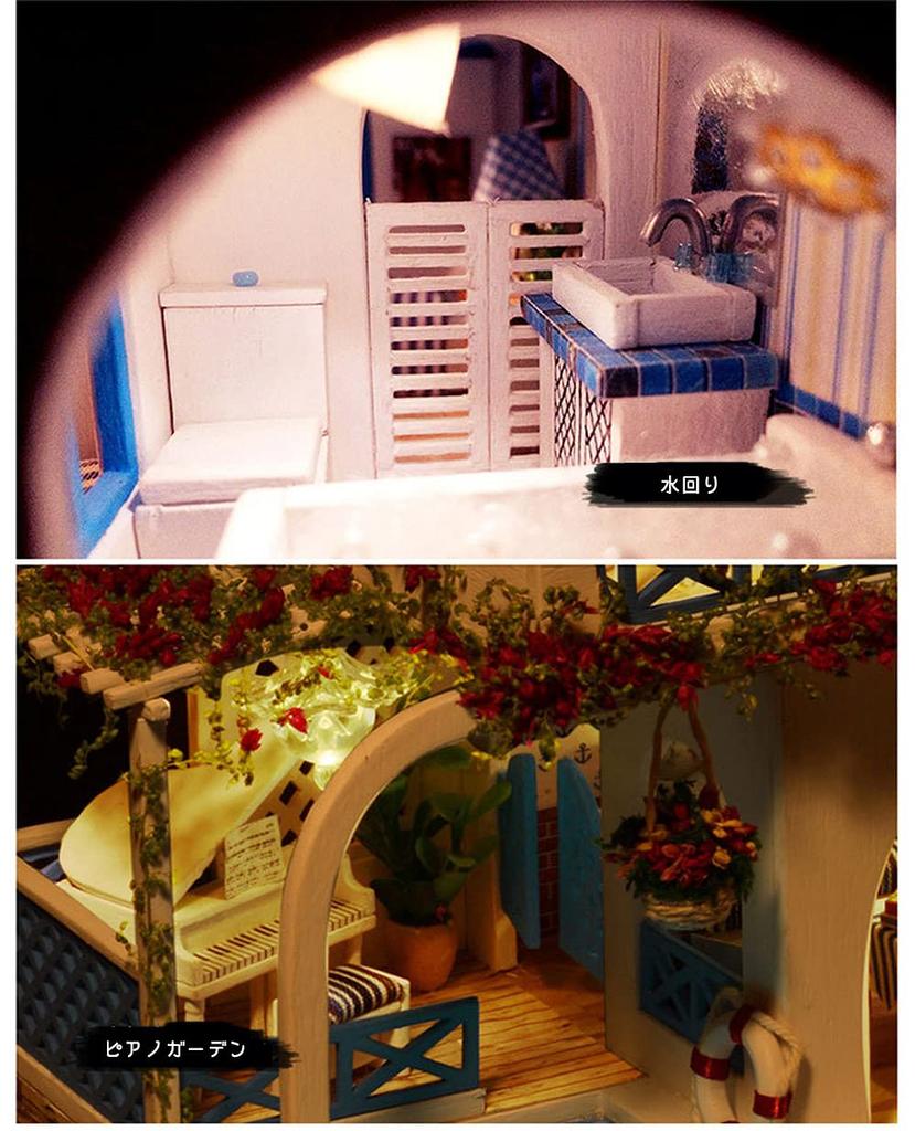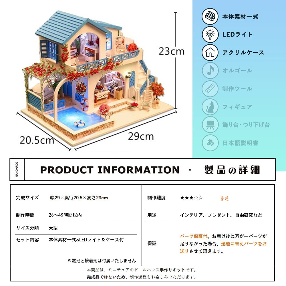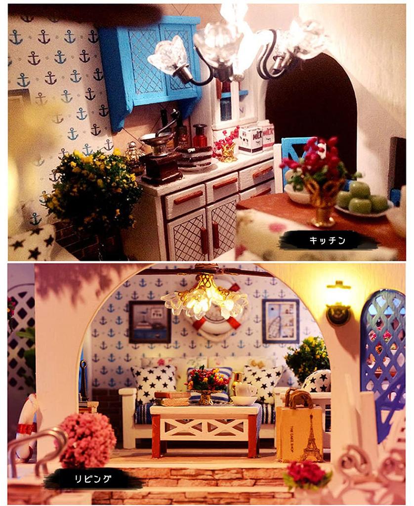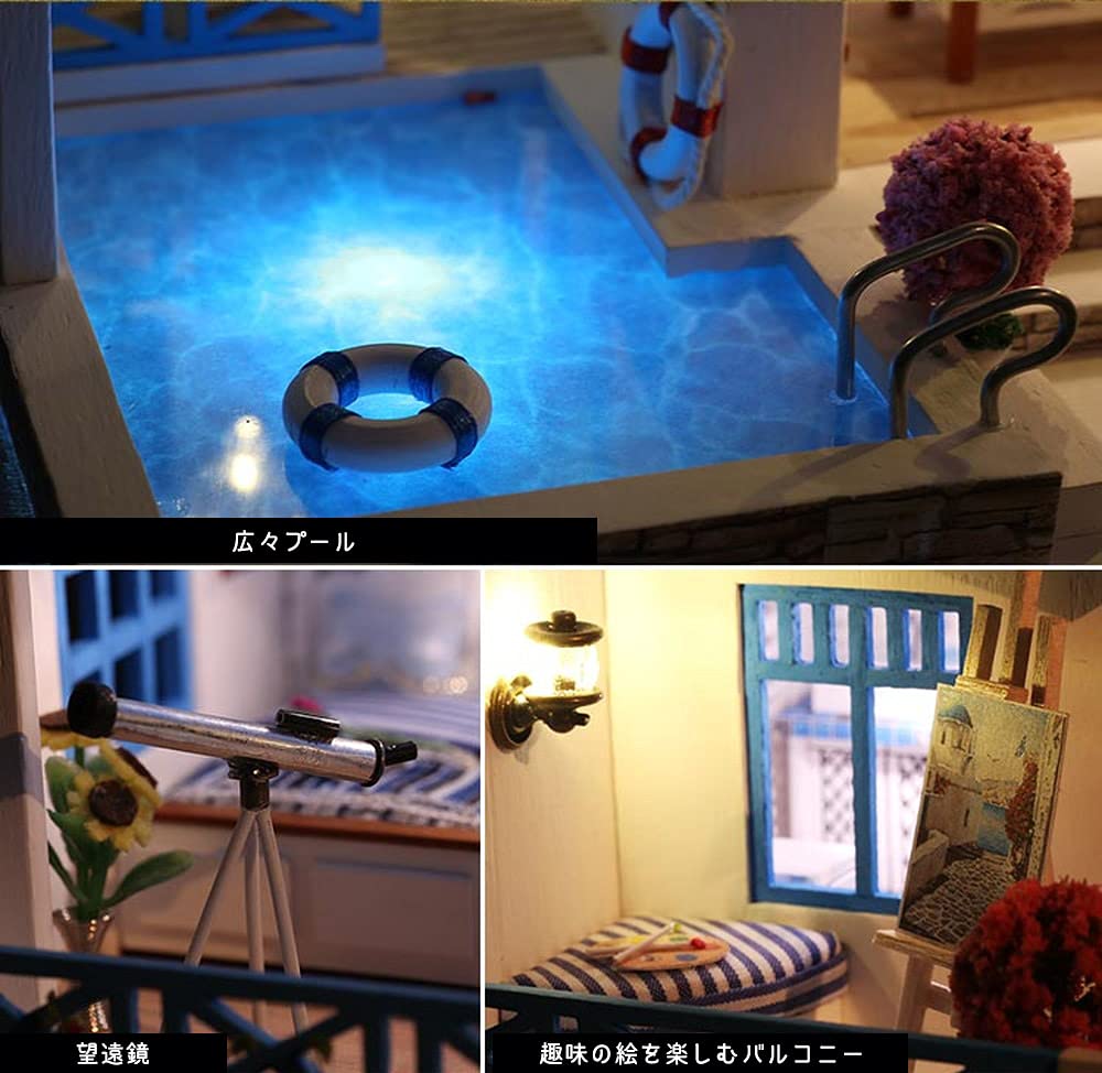 Этот продукт представляет собой набор для сборки миниатюрного кукольного домика в масштабе 1/24.. Свет на самом деле включается. На доме с синей крышей у моря много красных цветов.. Здесь есть на что посмотреть: улыбающуюся собаку, красивую подсветку бассейна и мебель цвета морской волны.