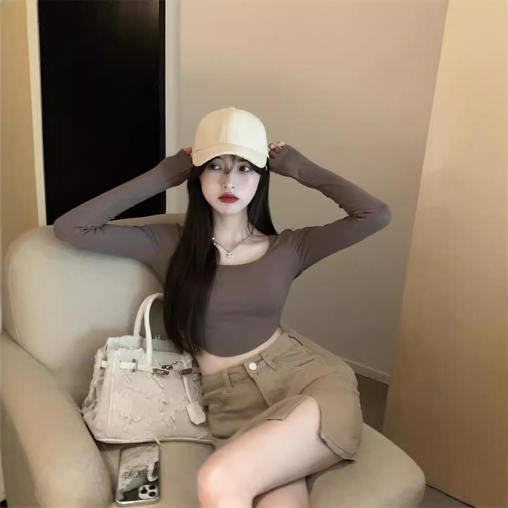 Футболка с узкими длинными рукавами, нижняя часть рубашки, открытый живот, горячая девушка, короткая студентка, женская короткая женская