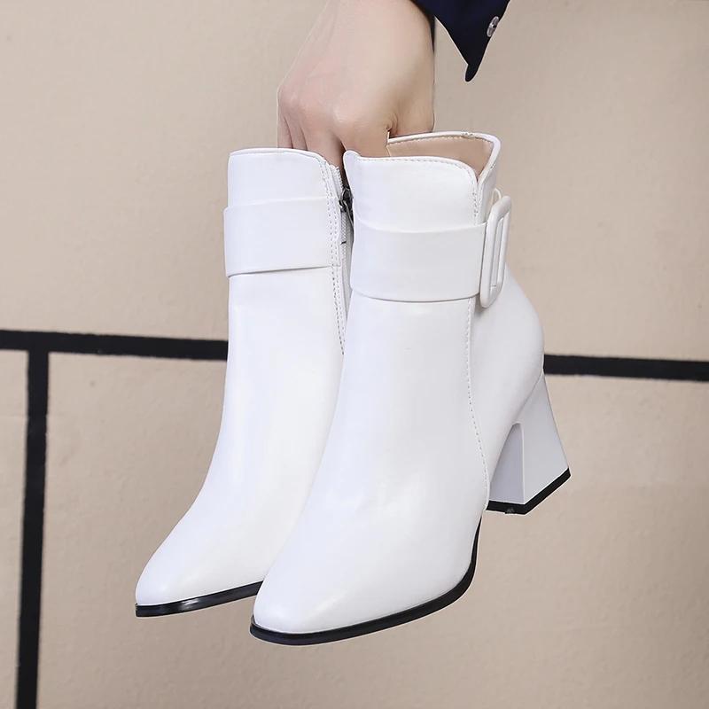 Белые, черные ботильоны на толстом высоком каблуке, женские согревающие элегантные короткие ботильоны с острым носком, женские украшения с пряжкой на щиколотке