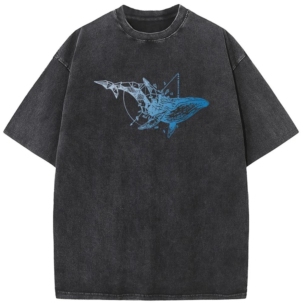 Футболка унисекс с принтом кита и геометрией, новинка, хлопковая летняя отбеленная футболка, забавная повседневная свободная отбеленная футболка