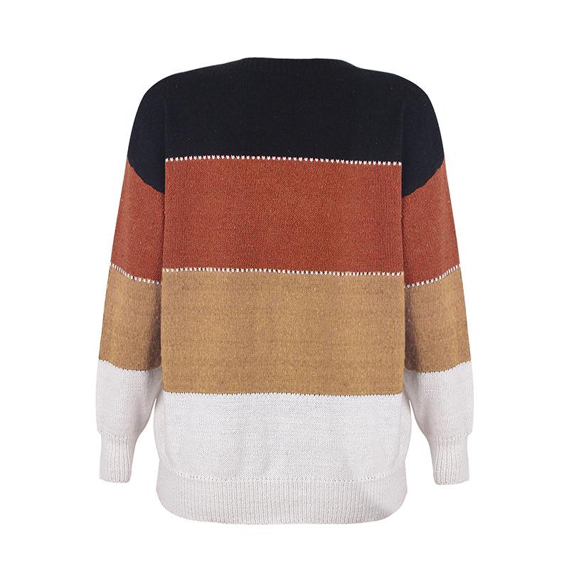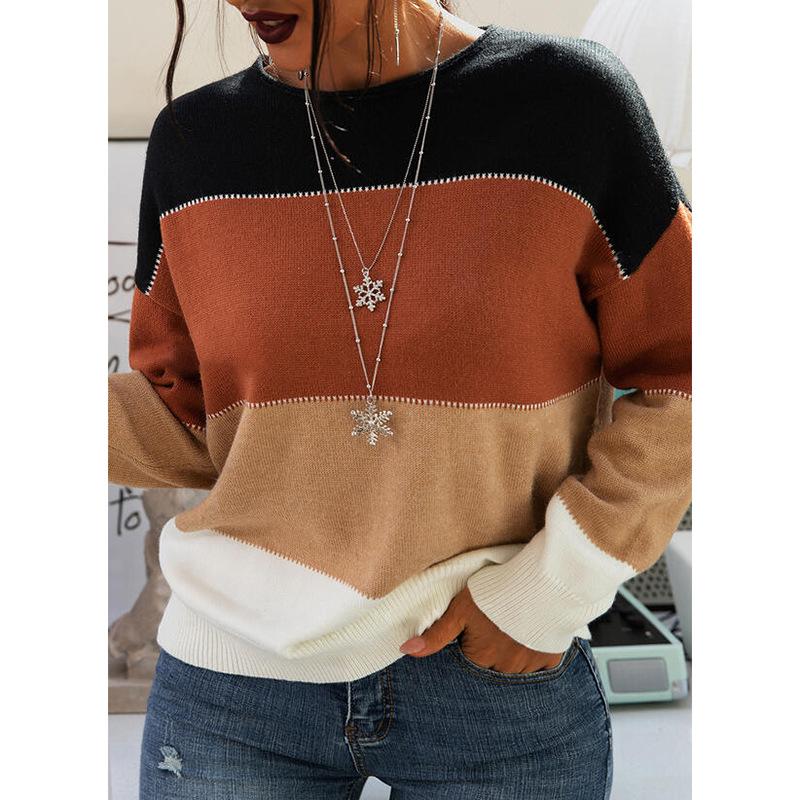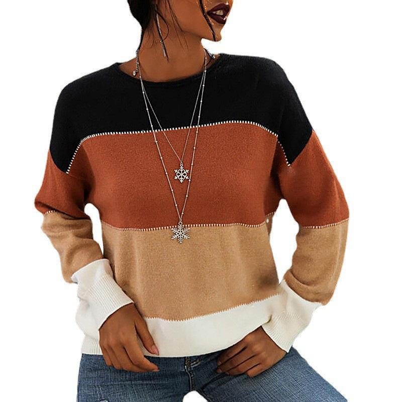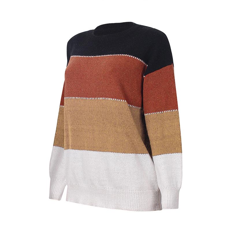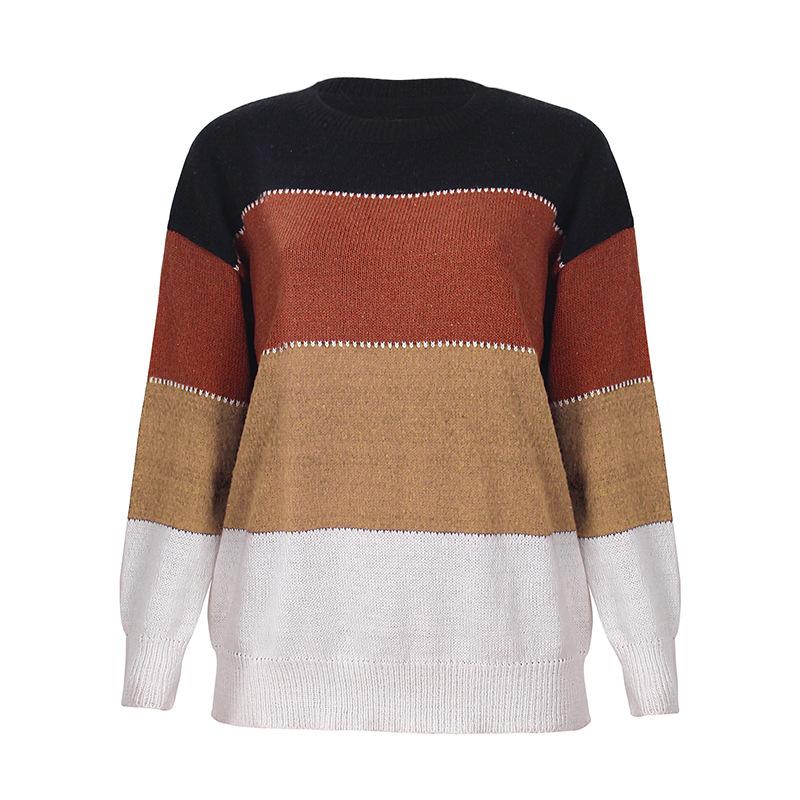 Осенне-зимний новый стильный свитер в полоску контрастного цвета с длинными рукавами и круглым вырезом, женский вязаный свитер