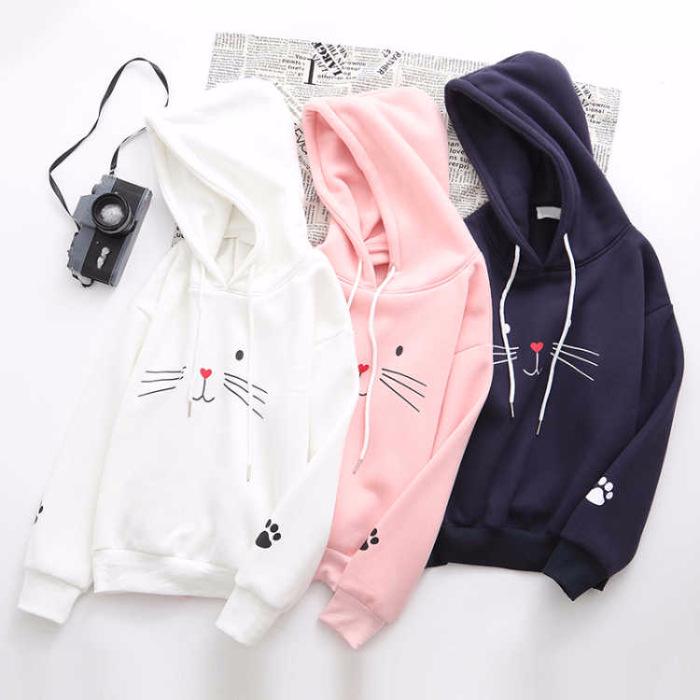 Женские теплые мягкие толстовки с капюшоном, вышитая мордочка кошки, женский осенне-зимний студенческий литературный кот, длинный рукав, утепленный милый свитер