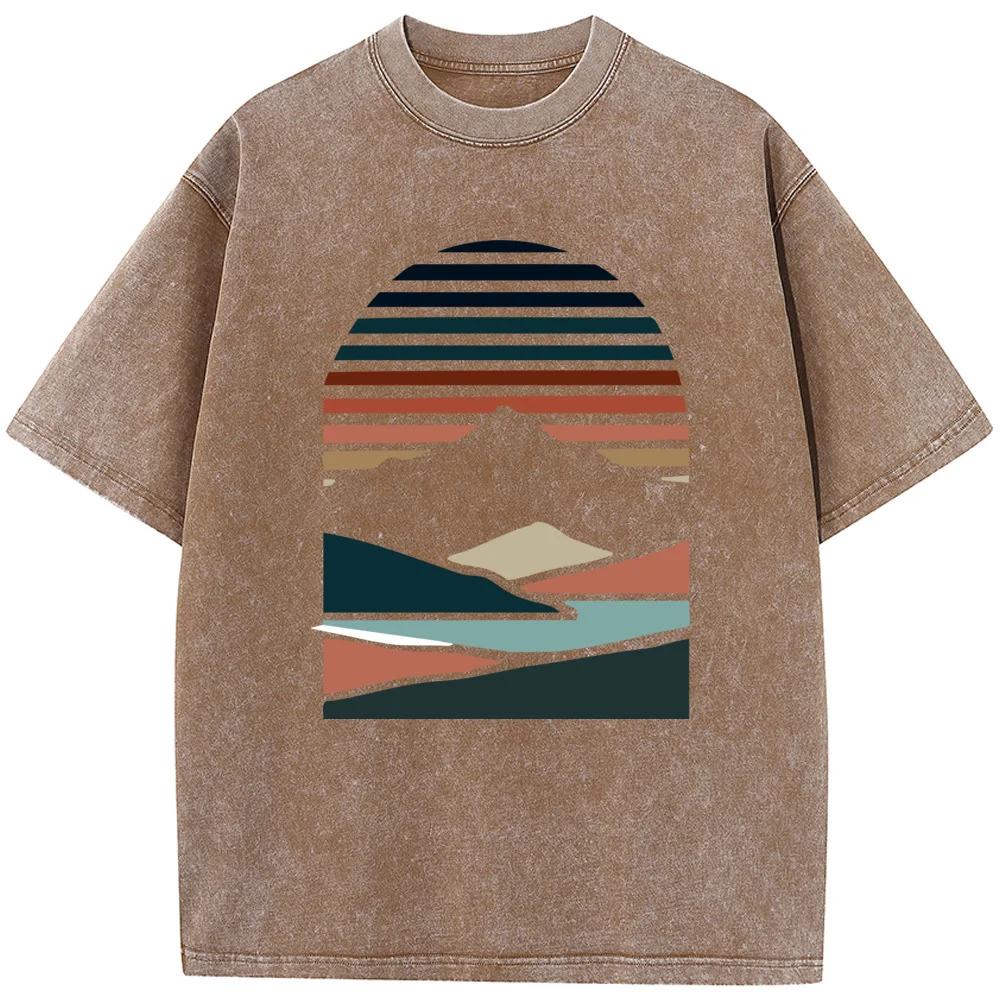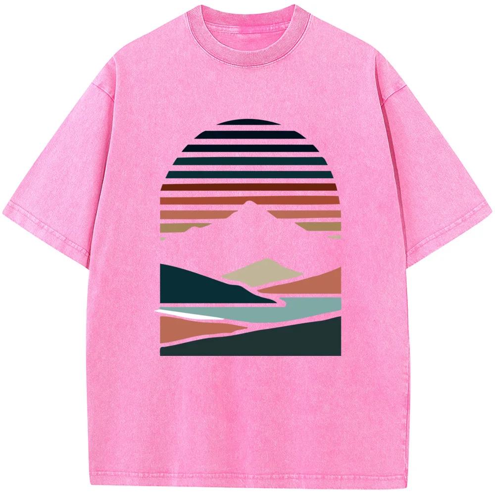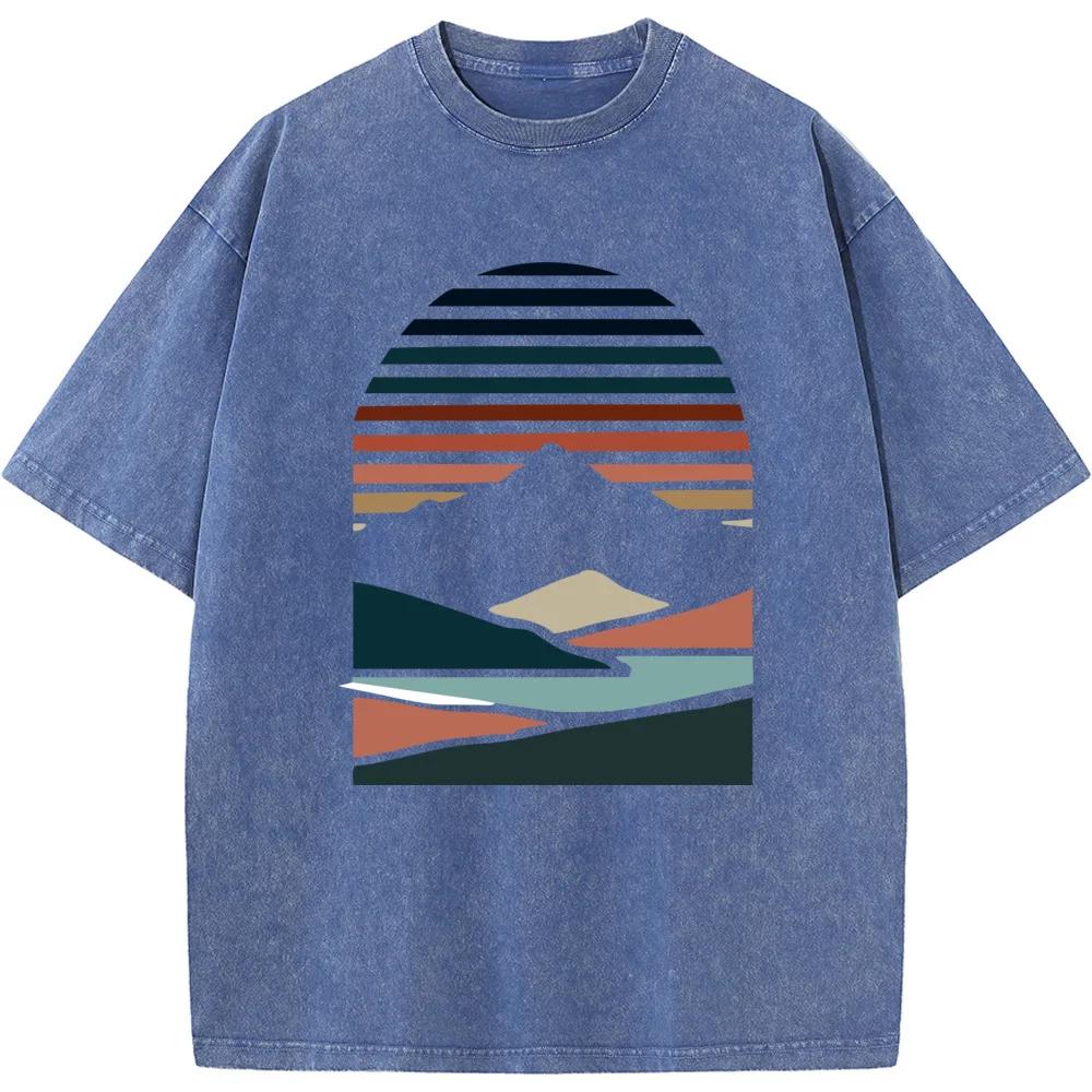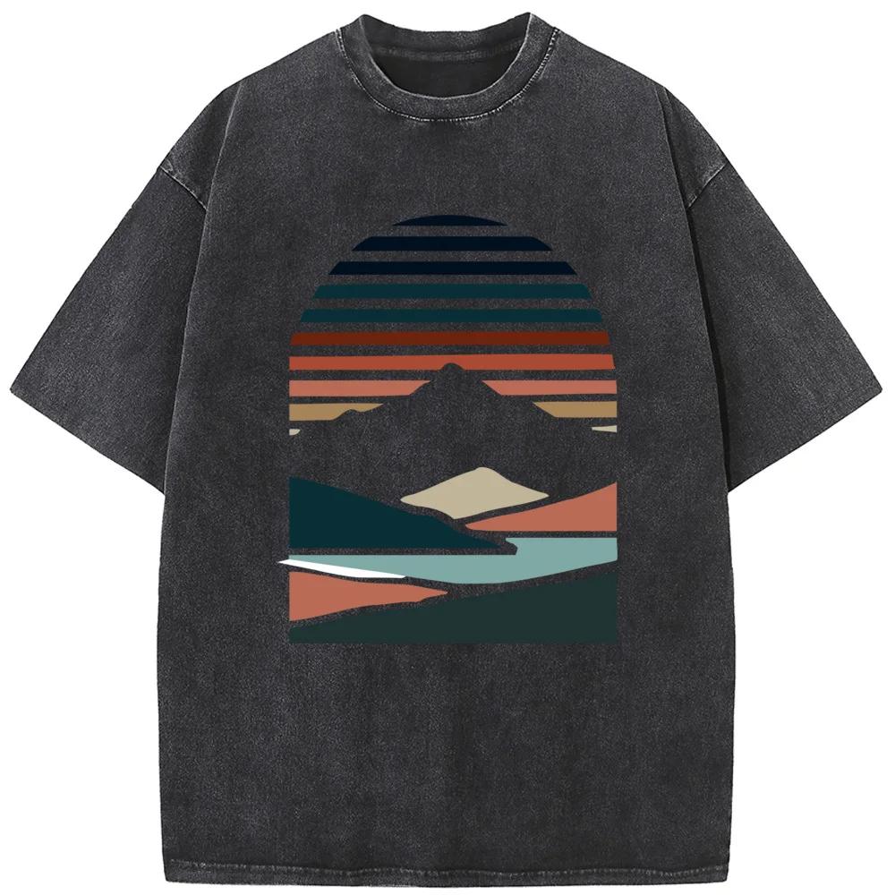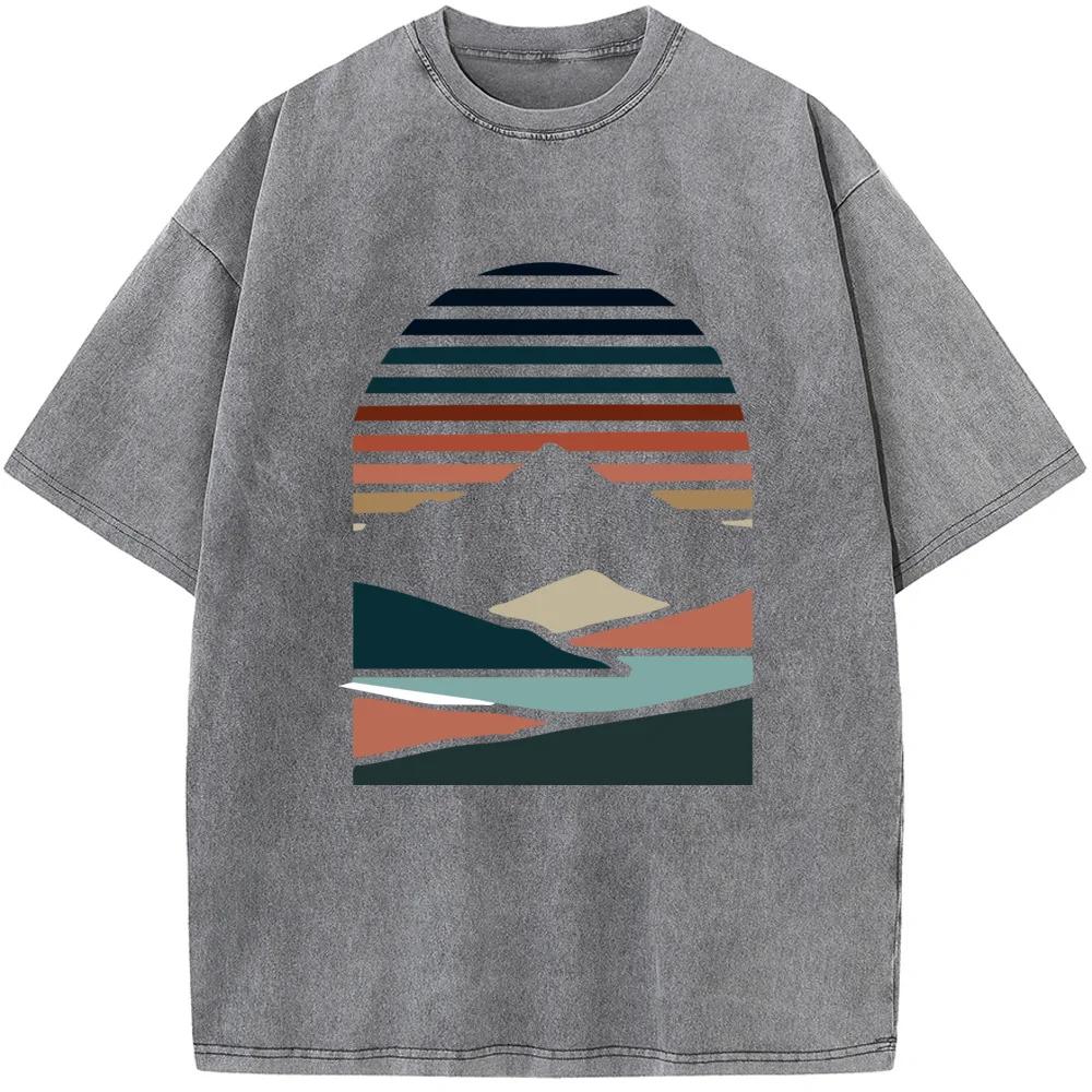 Мужская ретро-геометрическая футболка Maca Sunset Mountain с короткими рукавами, модная свободная стираная футболка из хлопка, летняя отбеленная хлопковая футболка