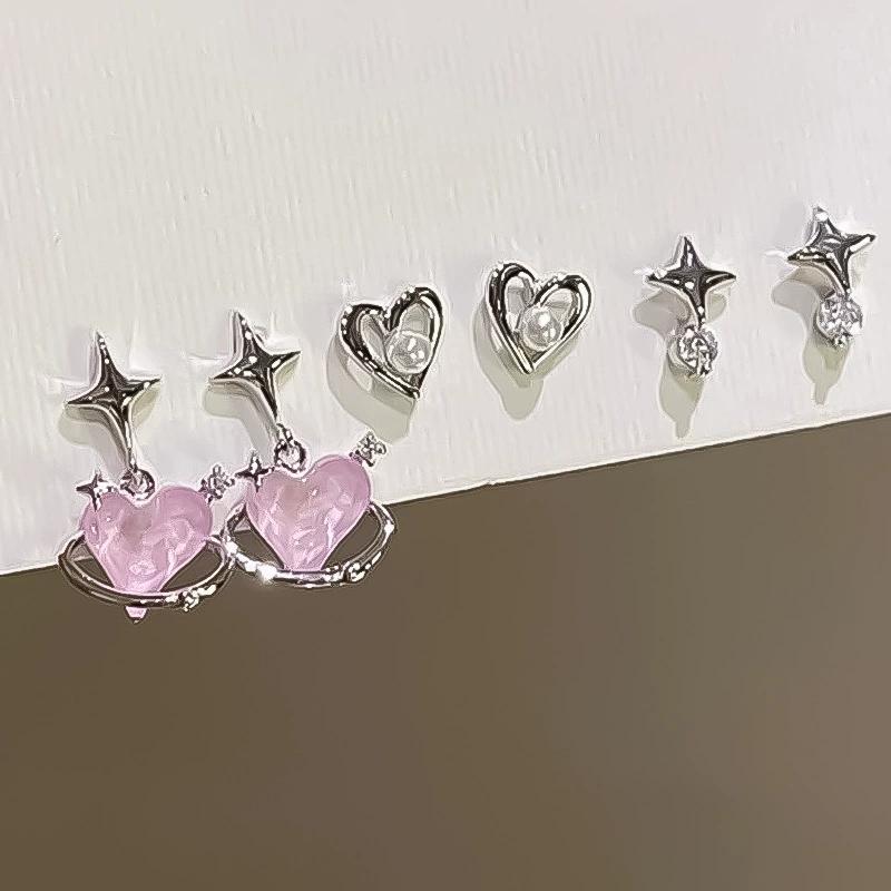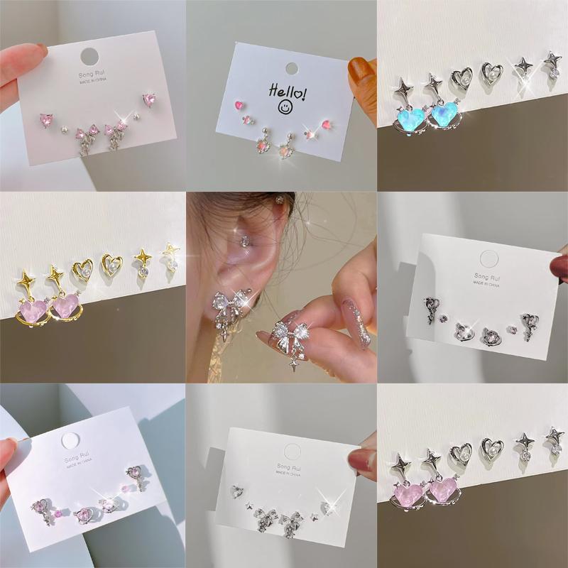 INS Y2K розовые серьги-гвоздики в форме сердца для женщин и девочек корейский комплект сережек-бантов с подвесками из сладких кристаллов модные ювелирные изделия