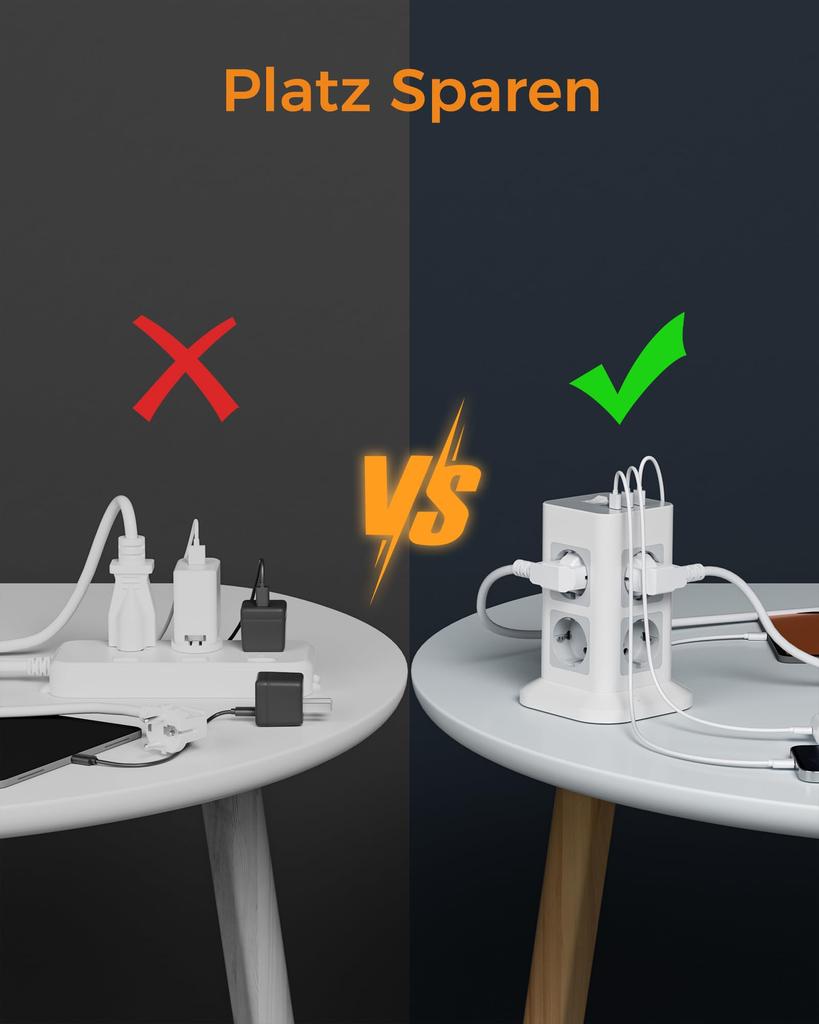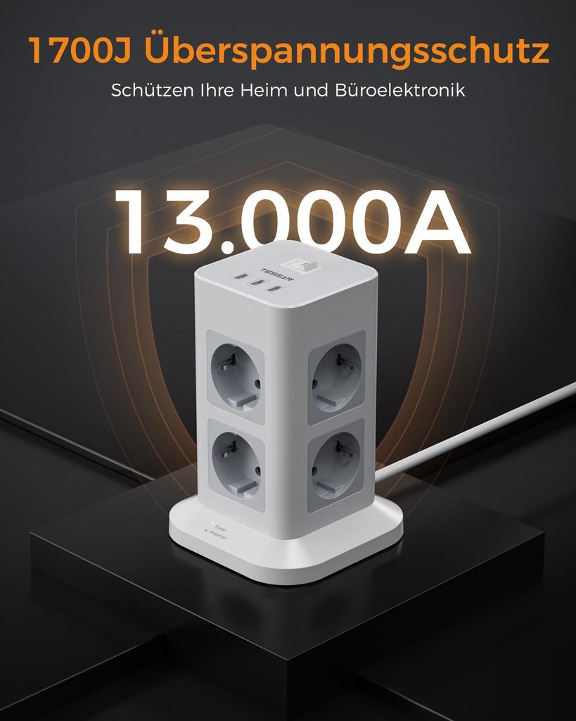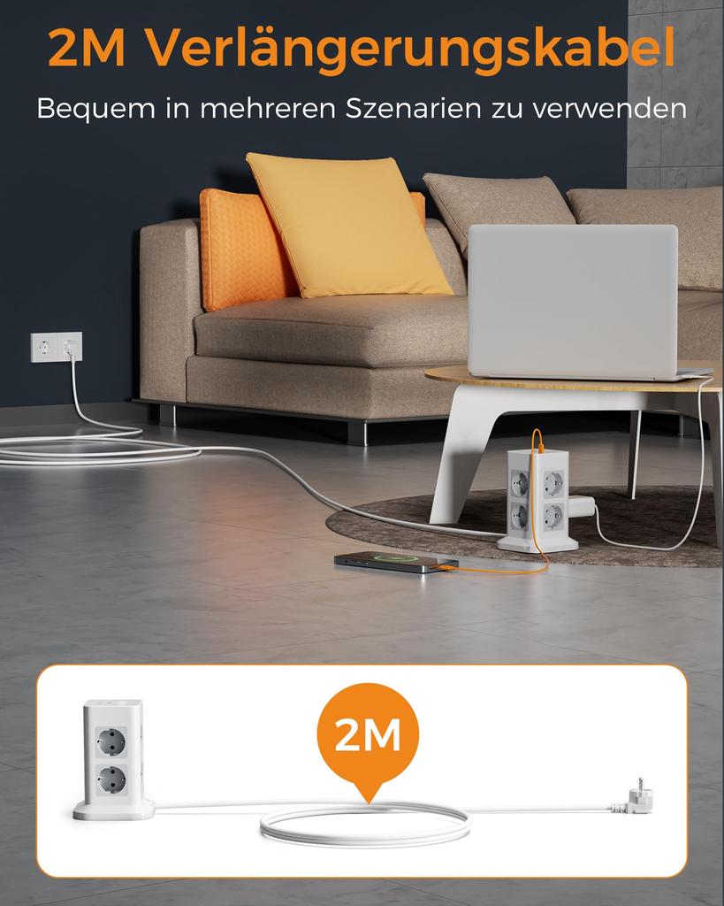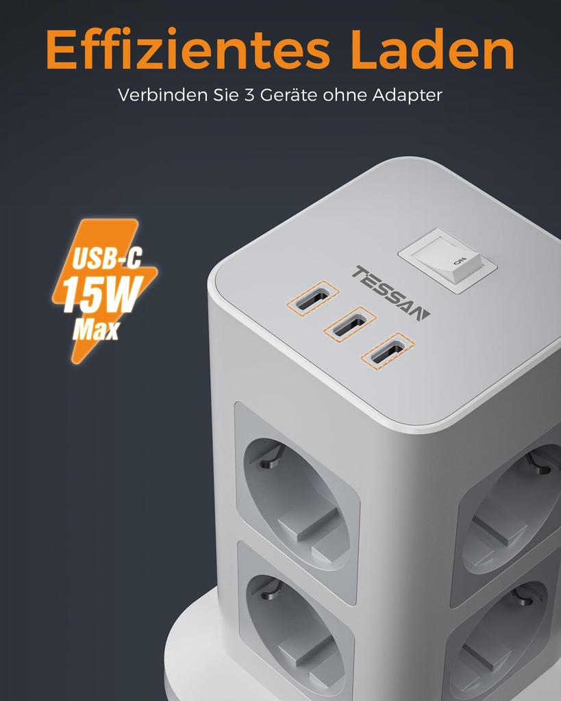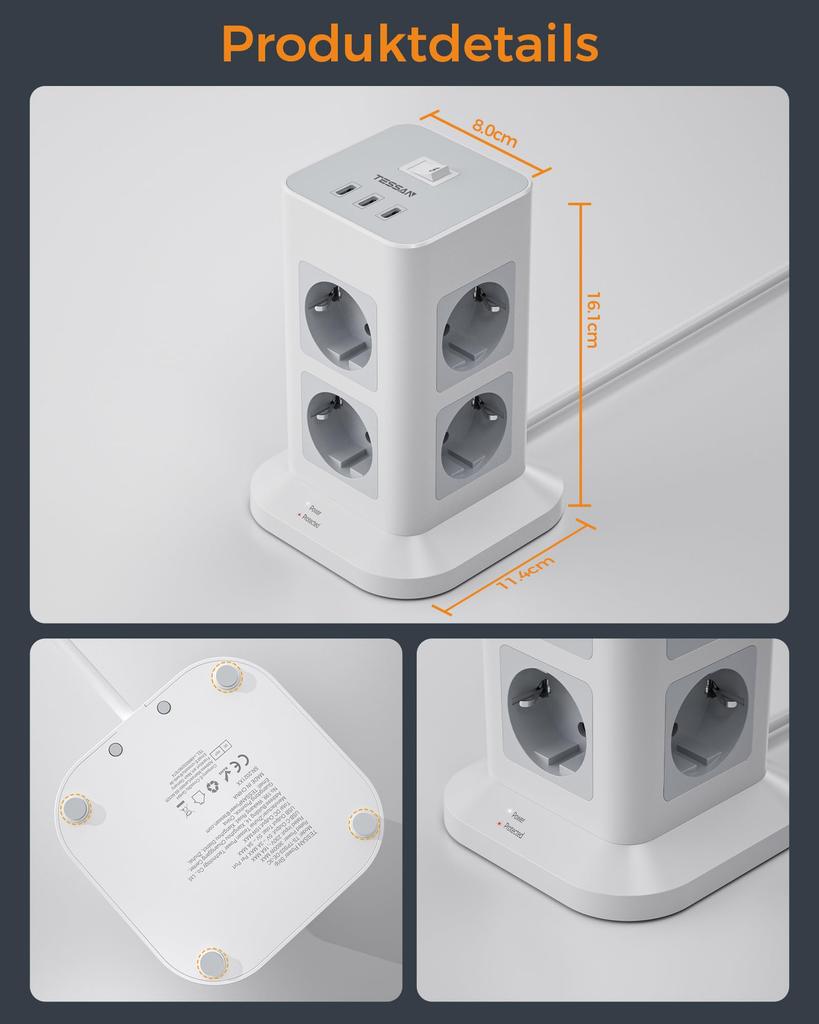 Tessan Башня 8-позиционная розетка Multi Power Strip Вертикальный 2-метровый удлинитель с вилкой ЕС с 3 портами USB C Выключатель защиты от перенапряжения