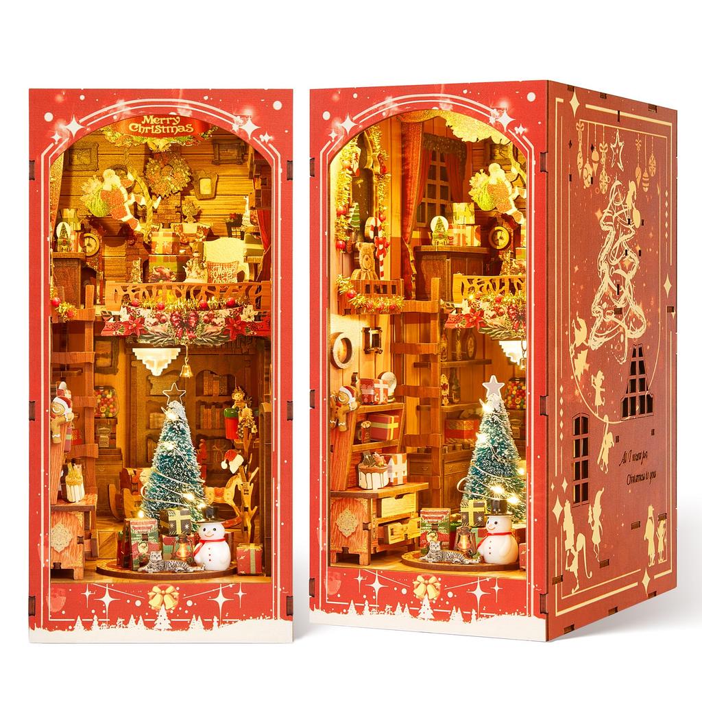 FUNPOLA Рождественский домик книжный уголок книжный уголок деревянная головоломка DIY миниатюрный кукольный домик со светодиодной подсветкой книжная полка держатель подставки для книг дисплей набор для творчества