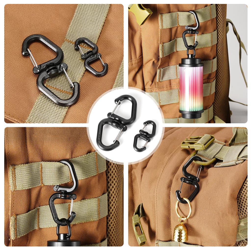 Этот вращающийся на 360 градусов двойной карабин с S-образными крючками надежно фиксирует вещи и не даст им сместиться, обеспечивая безопасность и надежность.