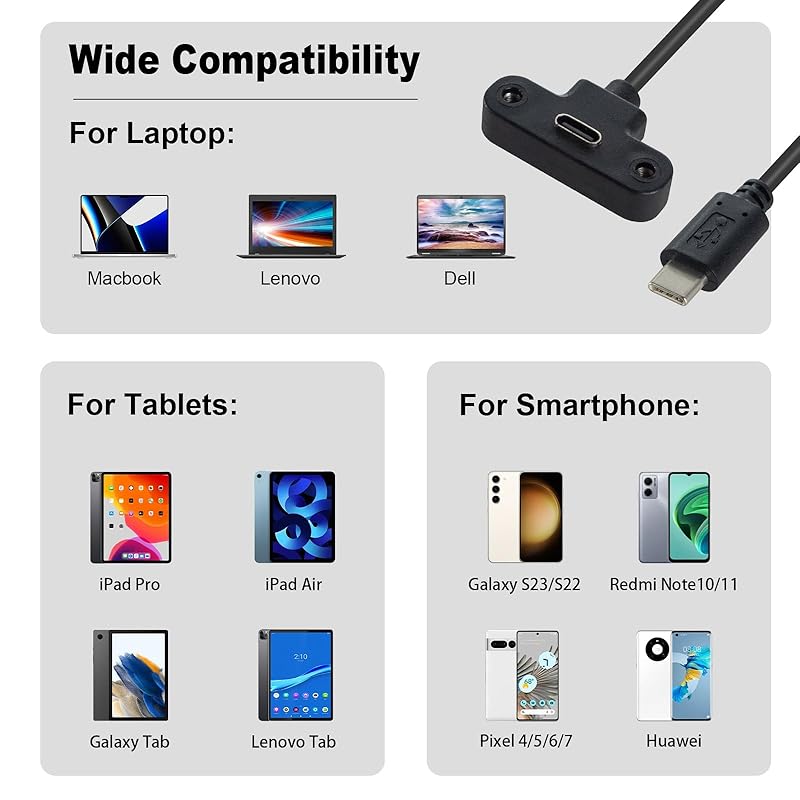 Удлинительный кабель USB C на 90 градусов. Поставляется с перегородкой, закрепленной винтами.. 90 градусов идеально подходит для использования в ограниченном пространстве.. Идеально подходит для всех телефонов с интерфейсом USB TYPE-C. 1 фут/0,3 м