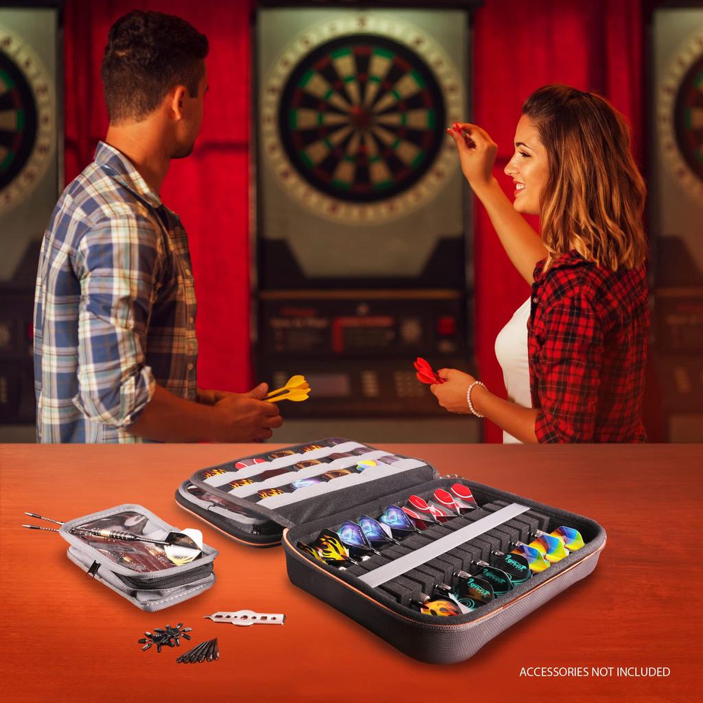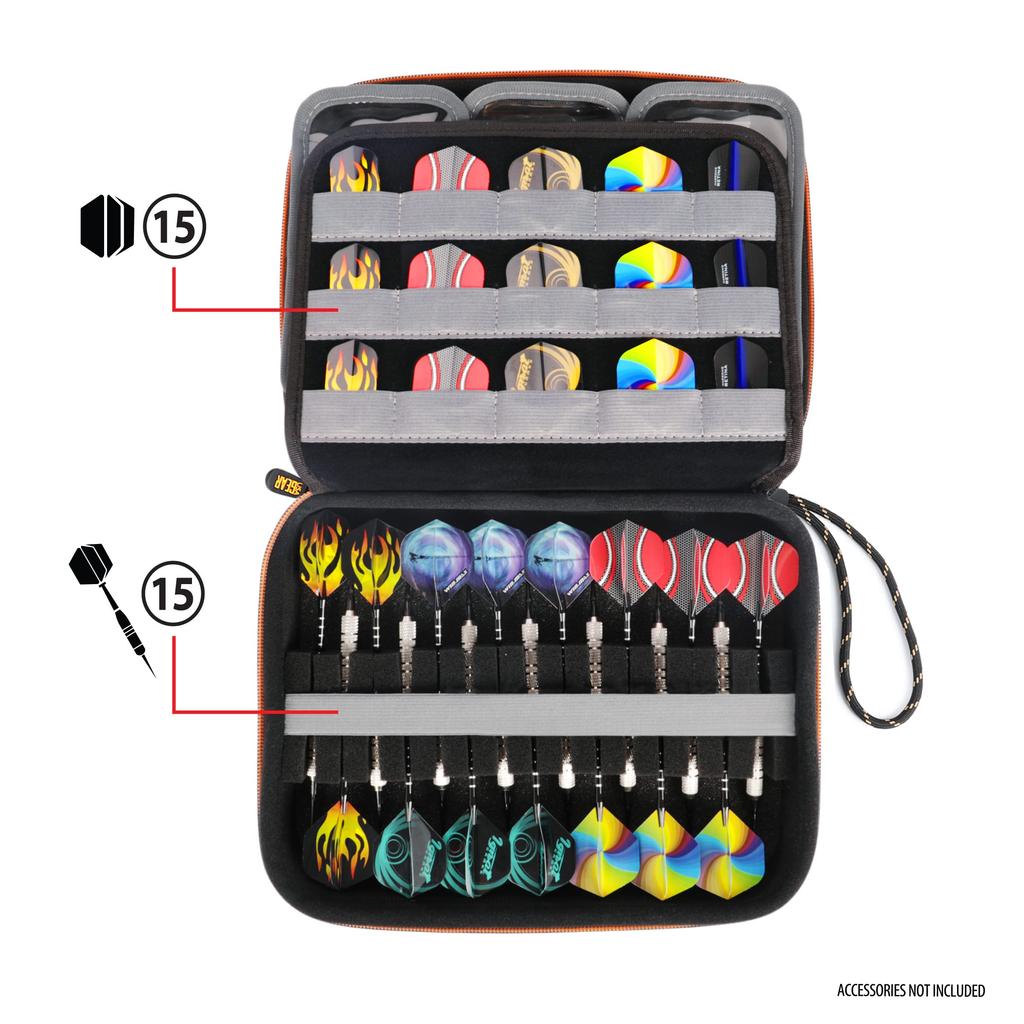 Просторный дизайн: Кейс для переноски дротиков вмещает 15 собранных дротиков, 15 оперений в эластичном слоте для аксессуаров, а также запасные наконечники и древки в 3 прозрачных карманах, устойчивых к проколам.