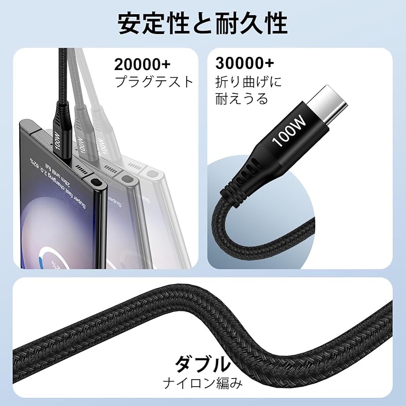 [Прочность и гибкость] Этот USB-кабель типа C был испытан на изгиб более 30 000 раз и показал отличную прочность. Помимо высокопрочного нейлона двойного плетения, мы используем различные методы обработки и защиты для достижения высокой прочности.