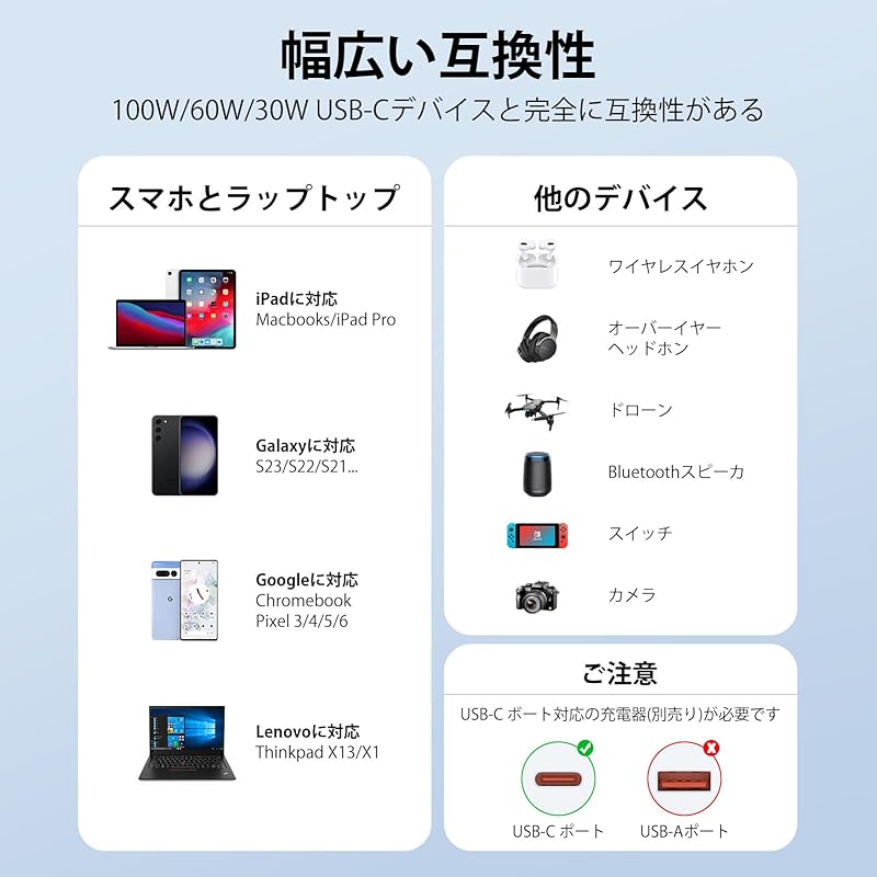 [Широкий спектр совместимых моделей] Android-смартфоны и планшеты, различные устройства, iPhone 15 серии, MacBook Pro 2021, Macbook Air 2020, iMac, iPad Pro 5-го поколения, iPad Air, Galaxy s22 s21 tab s8, zenfone 8, Aquos sense6, wish, sense4, Xperia 5iii, oppo reno5 a, pixel6, xiaomi, moto g31, Huawei p30 и т. д. Порт USB-C обеспечивает высокоскоростную зарядку устройств USB-C, таких как смартфоны, планшеты и ноутбуки.(Пожалуйста, обрати внимание: Видеовыход не поддерживается.)