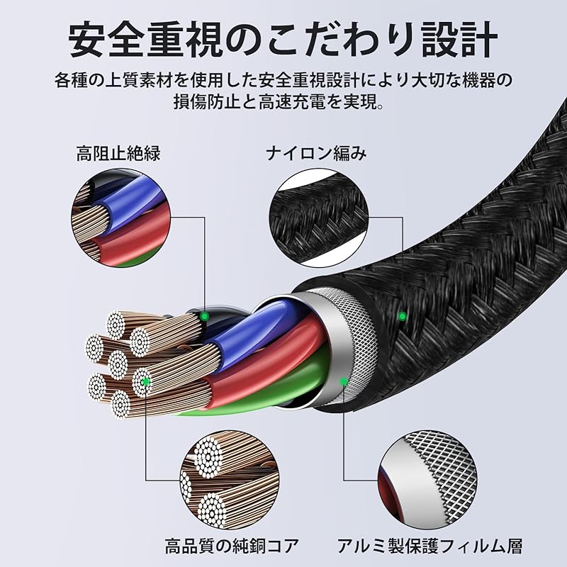 [Упор на скорость и безопасность] Этот USB-кабель оснащен резистором 56 кОм для повышения безопасности и имеет различные функции защиты, такие как защита от перезаряда, переразряда, перегрева и утечки. Он использует позолоченные контакты и огнестойкие материалы, которые устойчивы к ржавчине и предотвращают ухудшение сигнала, обеспечивая высокостабильную быструю зарядку и предотвращая повреждение важных устройств.