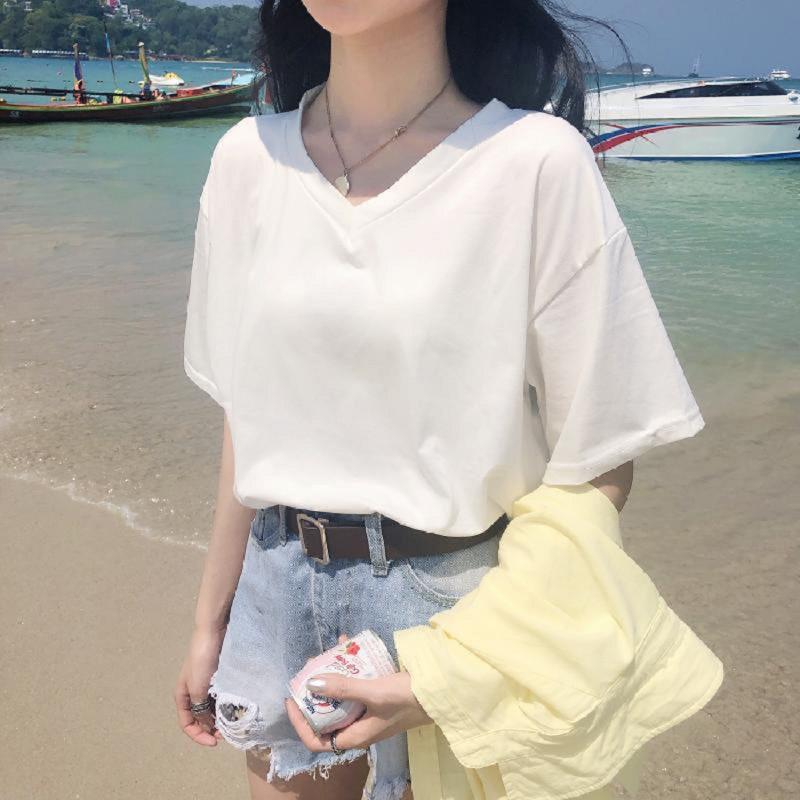 Однотонная свободная повседневная футболка с V-образным вырезом и короткими рукавами для женщин, летняя одежда, корейский стиль, студенческие топы, женская базовая рубашка, женская одежда — купить товар онлайн с бесплатной доставкой по всему миру!
