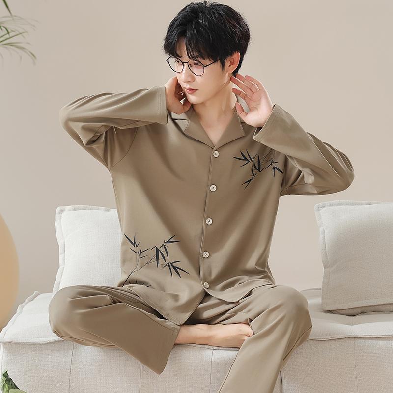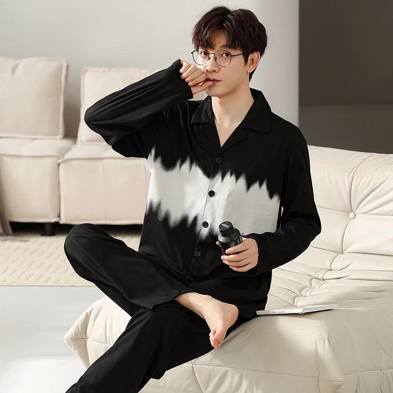 Осень-зима Мужская хлопковая пижама с длинными рукавами и длинными штанами Пижама для сна с лацканами Модная мужская домашняя одежда