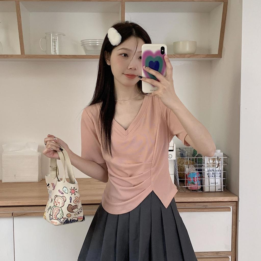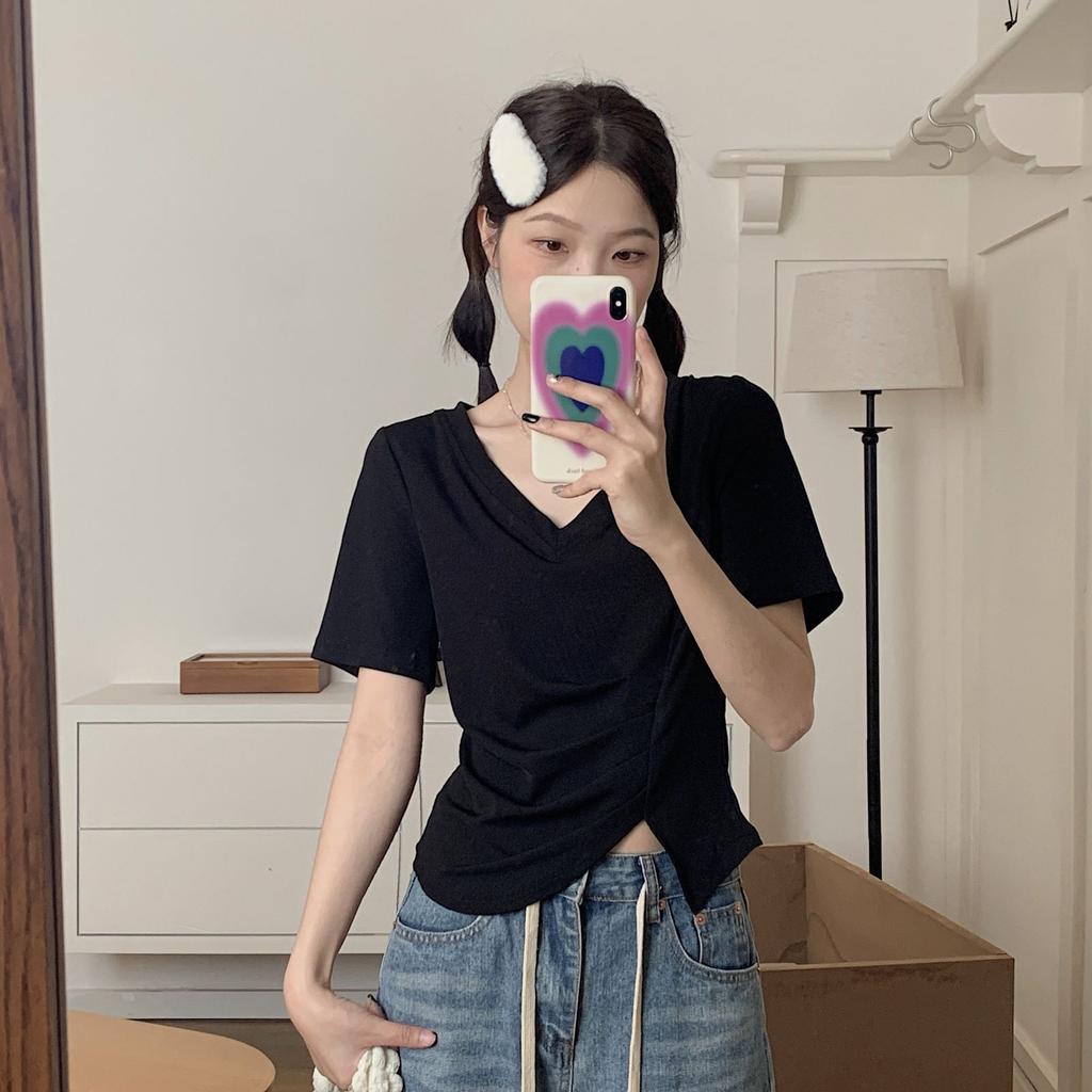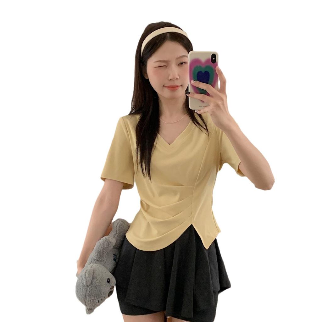 Женская футболка с короткими рукавами и нерегулярным V-образным вырезом, новая летняя плиссированная студенческая короткая базовая рубашка