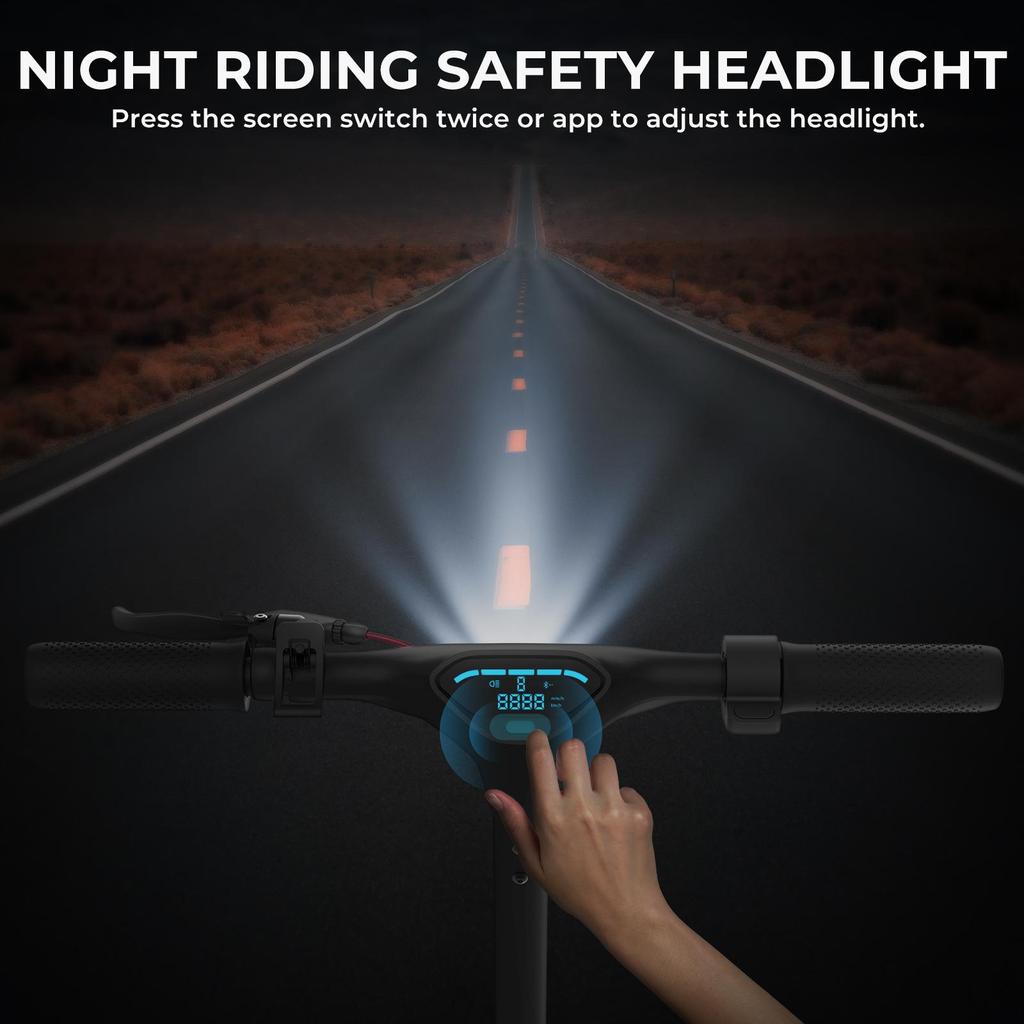Яркие фары освещают дорогу впереди, а задние стоп-сигналы обеспечивают вашу безопасность в темное время суток.. Фары можно отрегулировать, дважды нажав на экранный переключатель или на приложение.