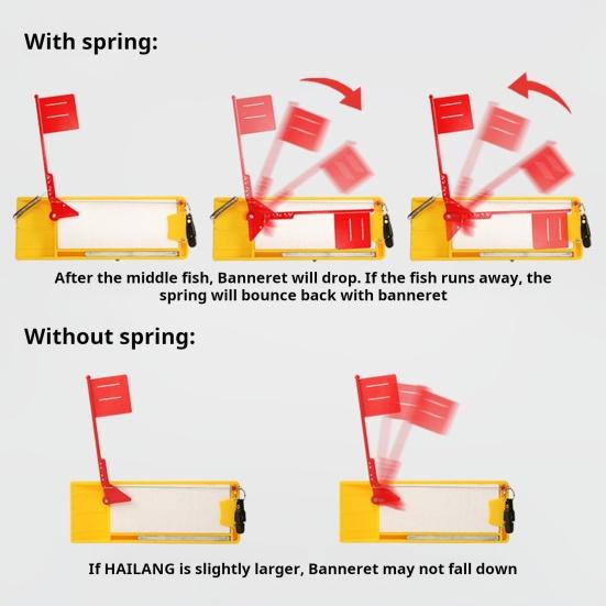 Подпружиненная конструкция: Усовершенствованная модель оснащена пружинным механизмом, который запускает опускание небольшого флажка при поимке рыбы.. Если рыба попытается вырваться, пружина быстро отскочит вместе с флажком.