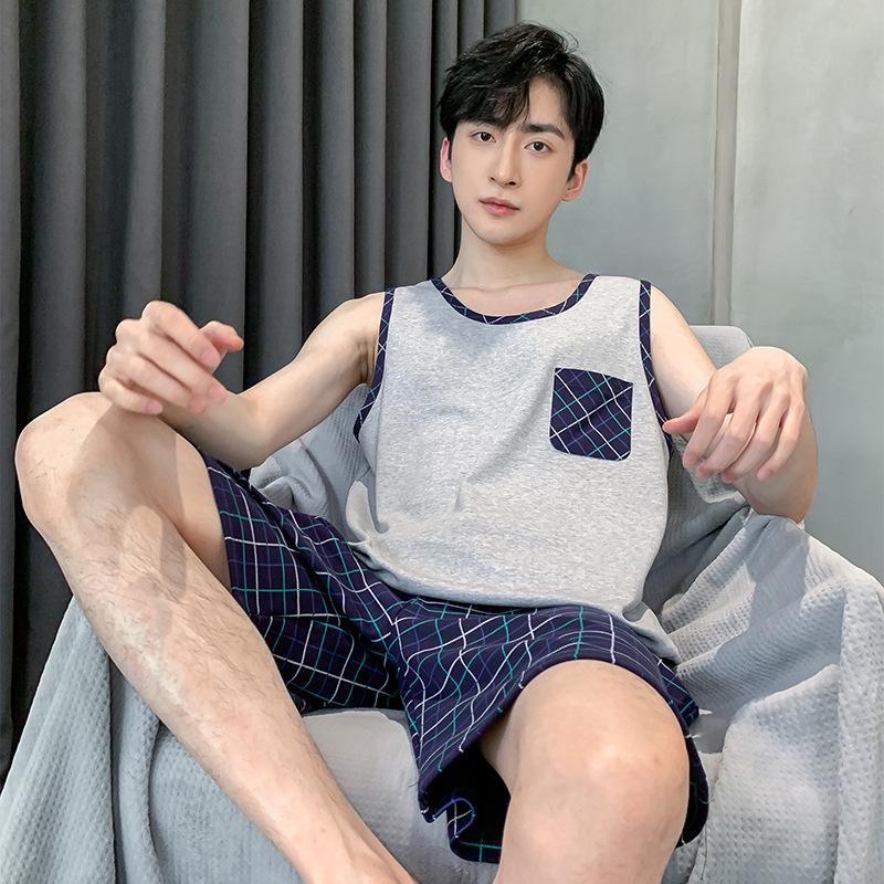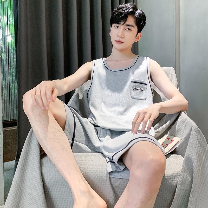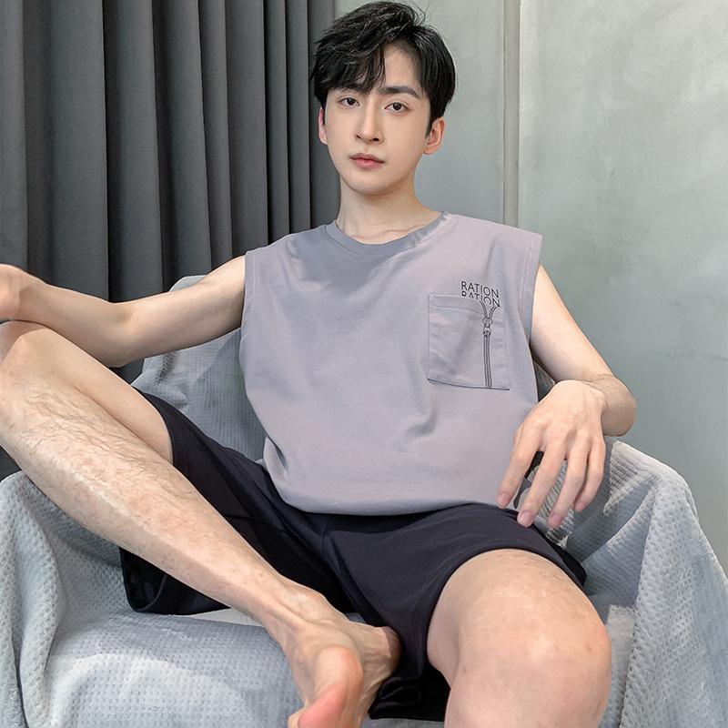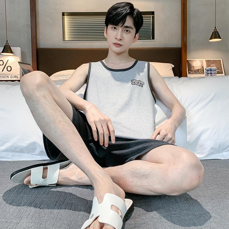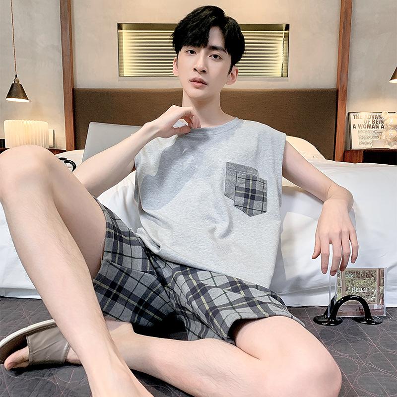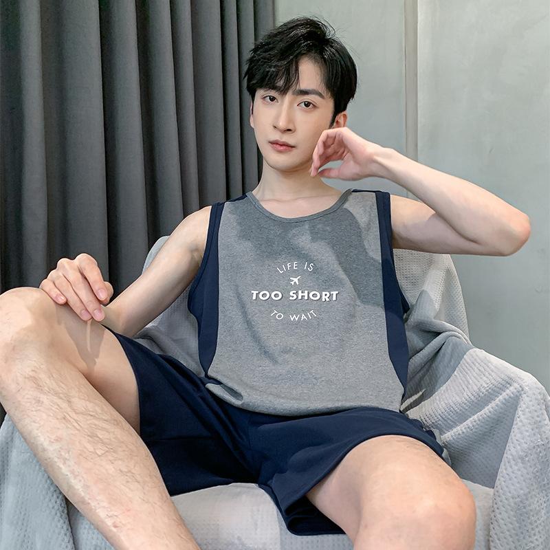 Мужской летний тонкий домашний костюм для подростков, круглый вырез, без рукавов, топ + шорты, комплект из двух предметов