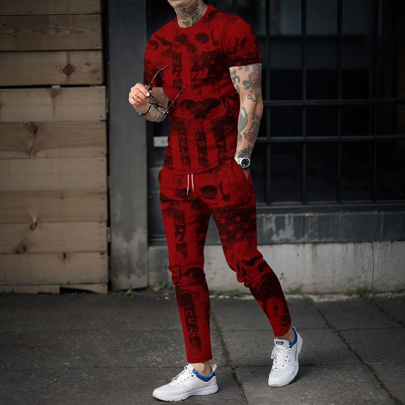 Новые летние мужские спортивные брюки, комплект из 2 предметов, футболка с короткими рукавами и принтом черепа 3D + брюки, уличная мода, праздничная мужская одежда