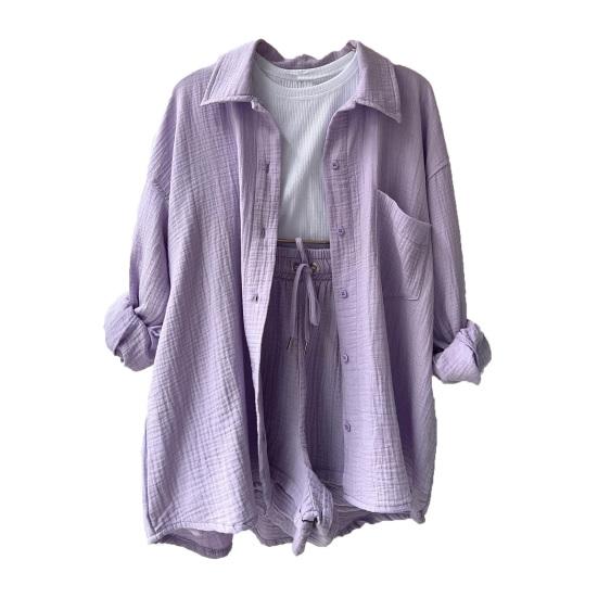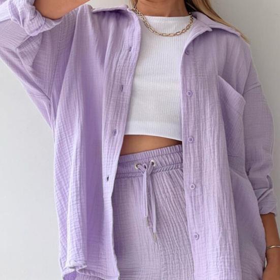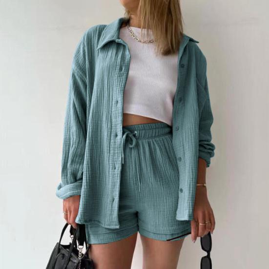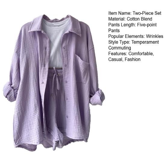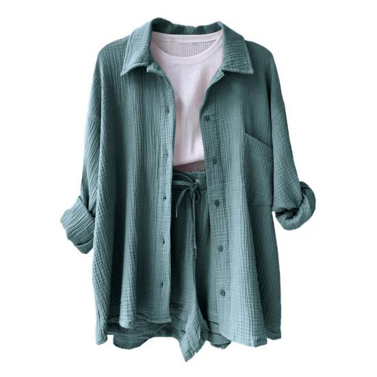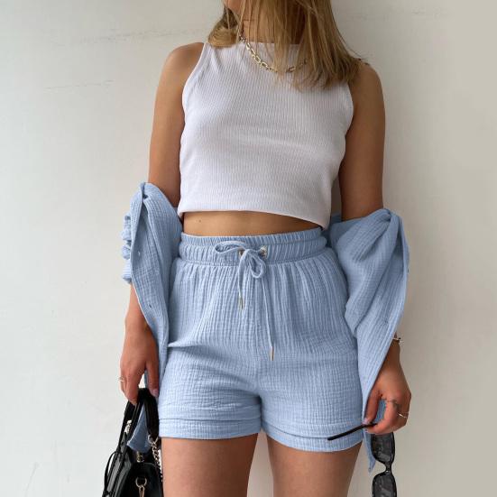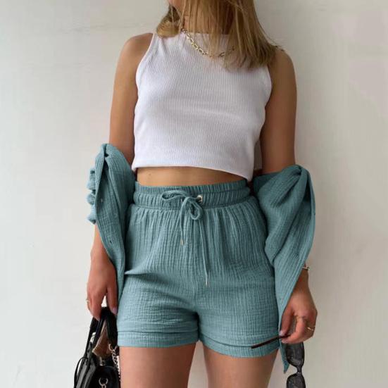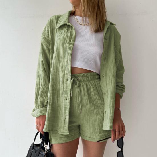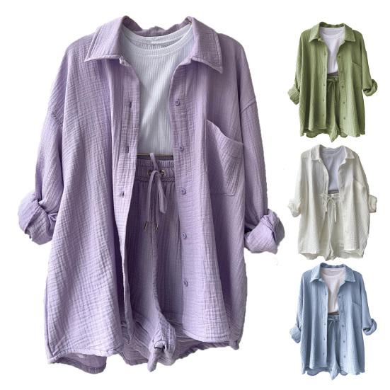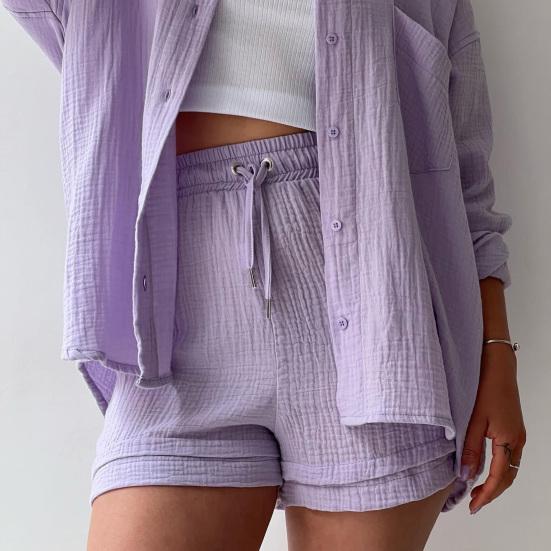 Премиум Материал: Этот женский комплект из рубашки и шорт, изготовленный из хлопка, обеспечивает мягкость и воздухопроницаемость.. Шорты с эластичной талией и без карманов практичны, а однотонный дизайн добавит универсальности вашему гардеробу.