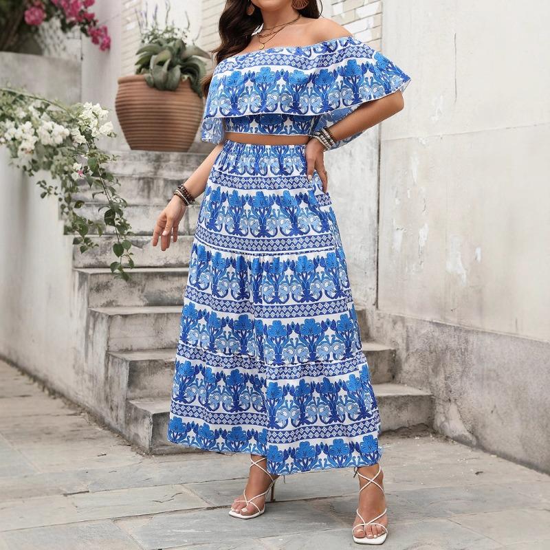 Женский праздничный повседневный костюм с однотонным вырезом и длинной юбкой на весну/лето