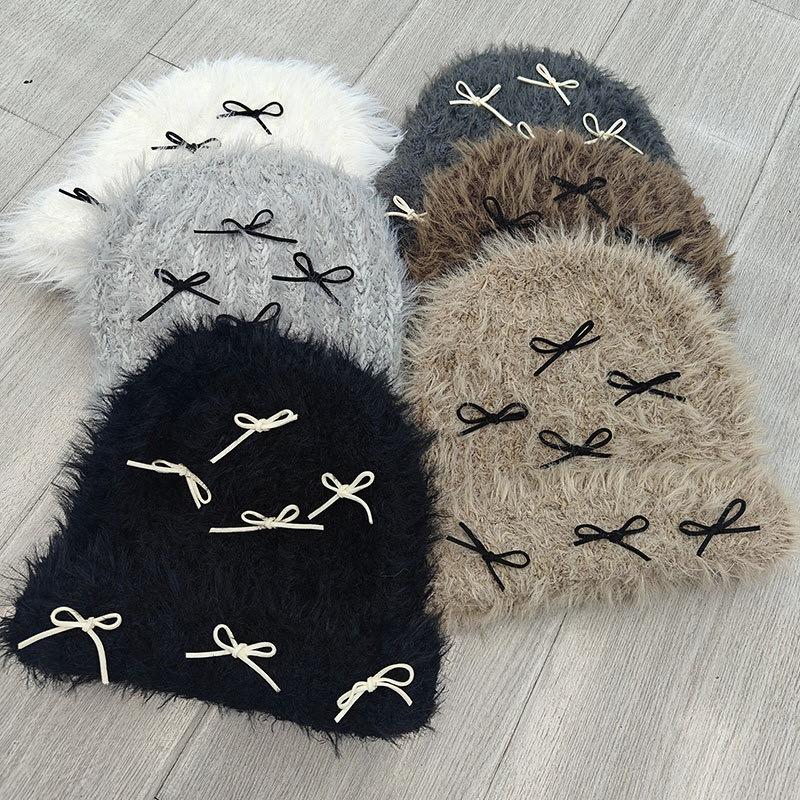 Универсальная для лица маленькая милая бантик вязаная теплая шапка на осень и зиму женская плюшевая шапка первая шапка
