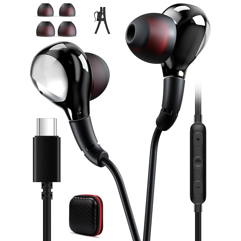 Ergonomic USB Type-C Connected Wired Earphones: These USB C earphones with microphone have an ergonomic canal tilted at 45°, which not only fits neatly in your ears, but also makes it more comfortable to wear.It doesn't make you feel uncomfortable, and it's light overall so you don't get tired easily.The lightweight design makes it very convenient to carry around.Three types of ear tips with different sizes are included.Even if you are just concerned about the fit, you can choose a comfortable tip.An earphone storage case is also included for organization.Perfect for sports/hiking and daily use.Not only that, it has enhanced compatibility with most USB C devices on the market, providing uninterrupted calls, high quality music, and music perfectly wrapped in your ears.