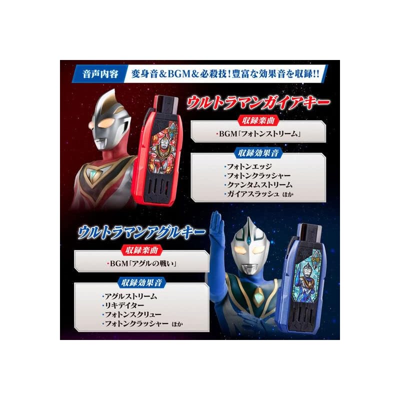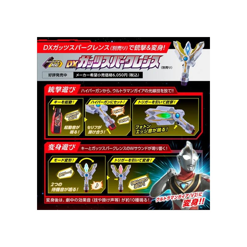 Из серии "Guts Hyper Key" из "Ultraman Trigger NEW GENERATION TIGA" мы коммерциализировали Guts Hyper Key из "Ultraman Gaia", который транслировался в 1998 году.. Каждая клавиша имеет спецификацию «DX Guts Hyper Key Premium», которая обеспечивает более высокую встроенную громкость звука и улучшенные характеристики воспроизведения, чем обычная клавиша DX Guts Hyper Key.. Вместе с уже выпущенными «Ultraman Tiga Key» и «Ultraman Dyna Key» Guts Hyper Key из «TDG (Тига Дайна Гайя)", которая называется трилогией Хэйсэй, наконец-то доступна. В набор входят 3 вида: Ключ Ультрамена Гайи, ключ Ультрамена Агула и ключ Высшей версии Ультрамена Агула. Каждая клавиша Guts Hyper Key имеет множество встроенных звуков для трансформации, криков и специальных приемов каждого Ультрамена, и их можно воспроизводить, нажимая кнопки на основном блоке или в сочетании с совместимыми игрушками.