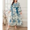 Плюс Размер Женщин Осень Новая Мода Принт Темперамент Пригородный V-образный вырез Swing Средней Длины Платье