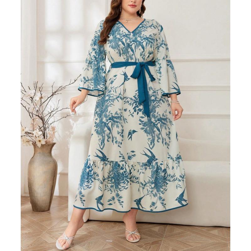Плюс Размер Женщин Осень Новая Мода Принт Темперамент Пригородный V-образный вырез Swing Средней Длины Платье — купить товар онлайн с бесплатной доставкой по всему миру!