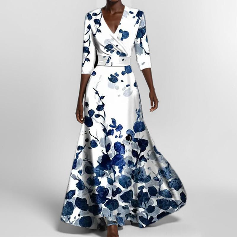 Женская мода элегантный темперамент V-образный вырез принт усаживаться плиссировка большой подол длинные платья
