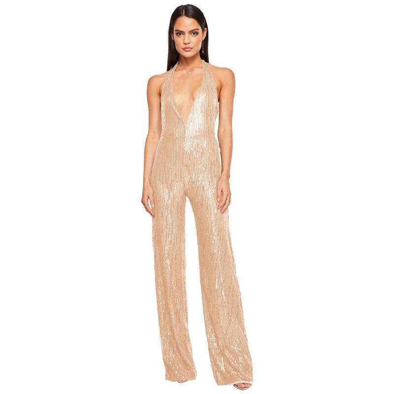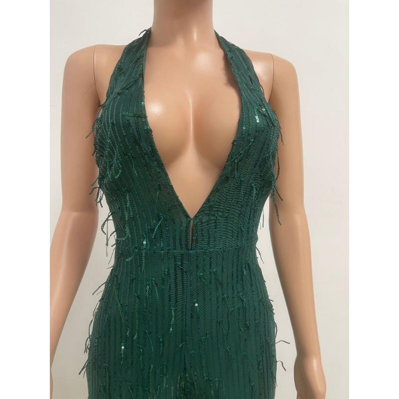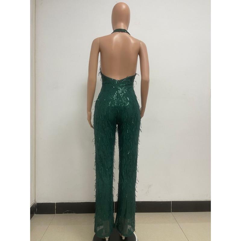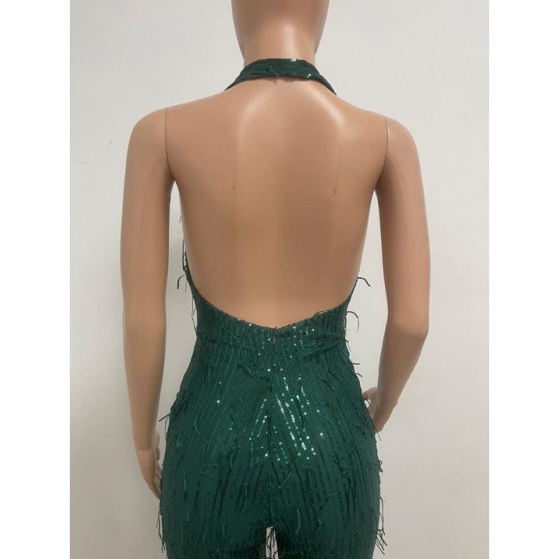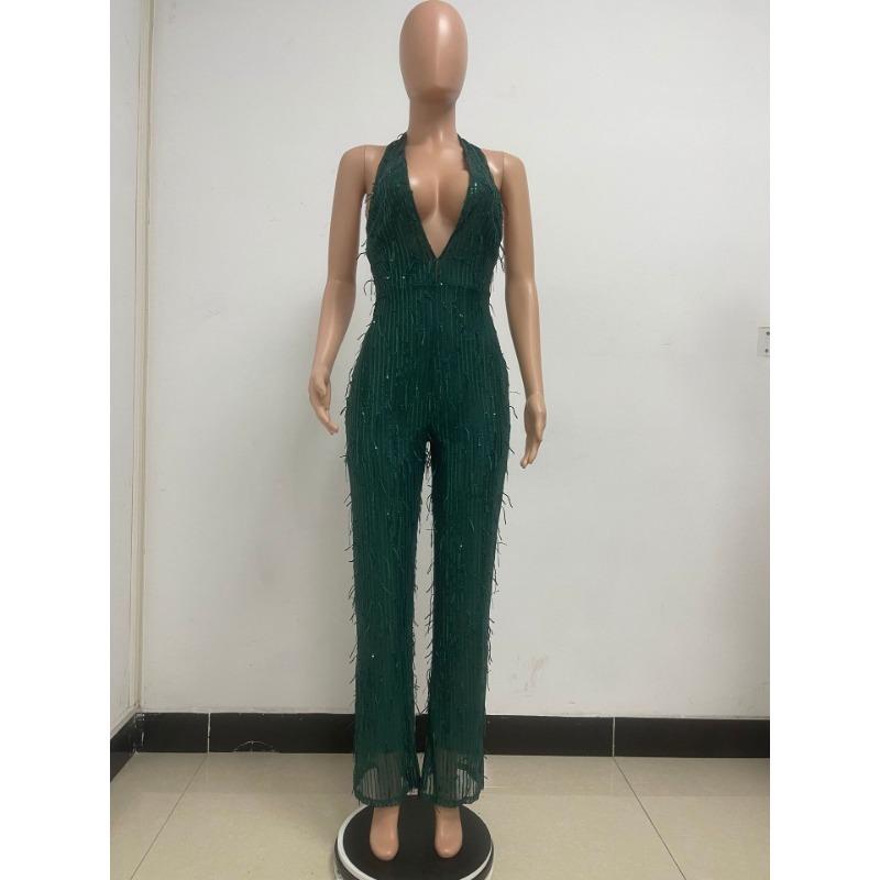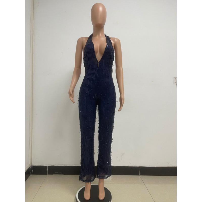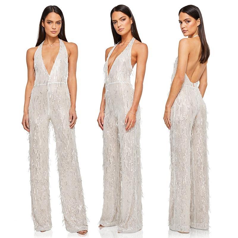 Женский летний комбинезон с глубоким V-образным вырезом без рукавов, блестками и открытой спиной с бахромой