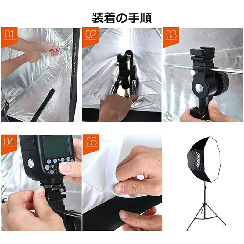 [Свободно регулируемый] Софтбокс в форме зонтика поставляется с утопленным кронштейном E-типа, который можно использовать как утопленное крепление, крепление для зонтика и штатива.. Вы можете отрегулировать зонт и вспышку под разными углами.