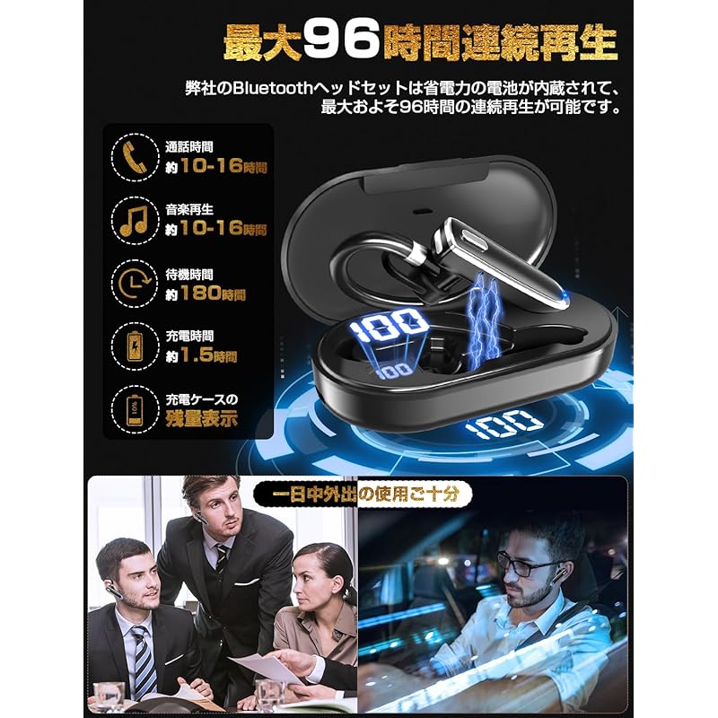 🏆🏆 [Up to 96 hours of continuous playback & Large capacity charging case included & LED remaining power display] With the spread of telework, web conferencing has become increasingly necessary.There are many people who want to be able to proceed with web meetings, which can sometimes be long, without stress.Based on customer feedback, our Bluetooth headsets feature a built-in power-saving battery that provides up to approximately 96 hours of continuous playback.It comes with a storage case, so you don't have to worry about running out of power even if you talk for a long time.Comes with an LED lamp, so you can check the remaining amount at a glance.It can be fully charged in about 1.5 hours with a Type C cable, and the main unit can be played continuously for 10-16 hours.In addition, when used in conjunction with the charging case, it can be used for a long time of about 96 hours in total.(Note: Playback time may vary depending on charging time, volume adjustment, playback content, usage environment, personal usage habits, connected devices, etc.))