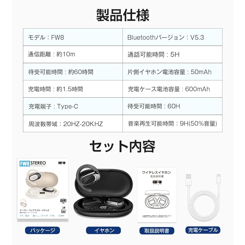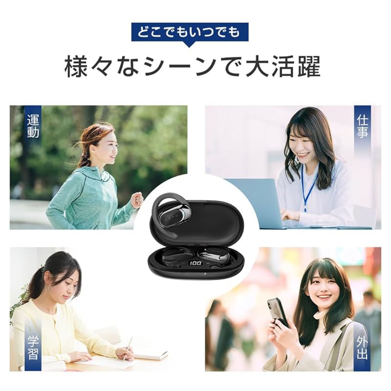 [Other features] ① Equipped with ear hooks that can be adjusted at an angle of 90°, ensuring a secure fit and stable wearing.②The weight of one earphone is only 9g, so you won't get tired even if you wear it for a long time.③Large capacity battery + low power consumption supports long-term operation.④ Daily waterproof level, sweat-proof and drip-proof.