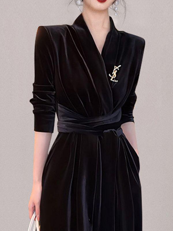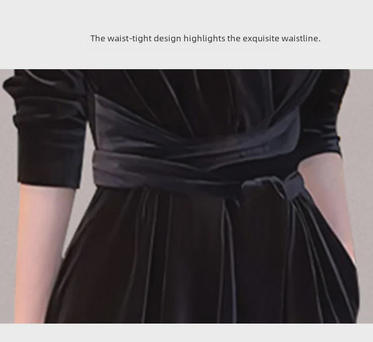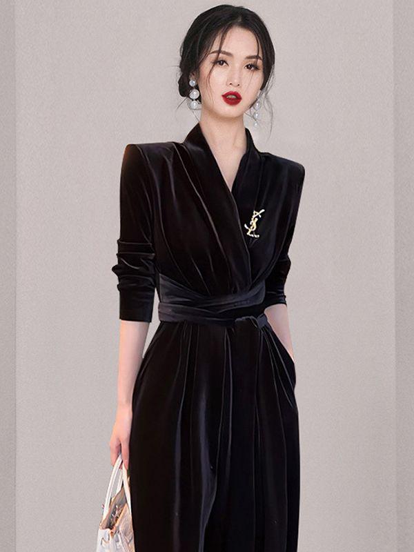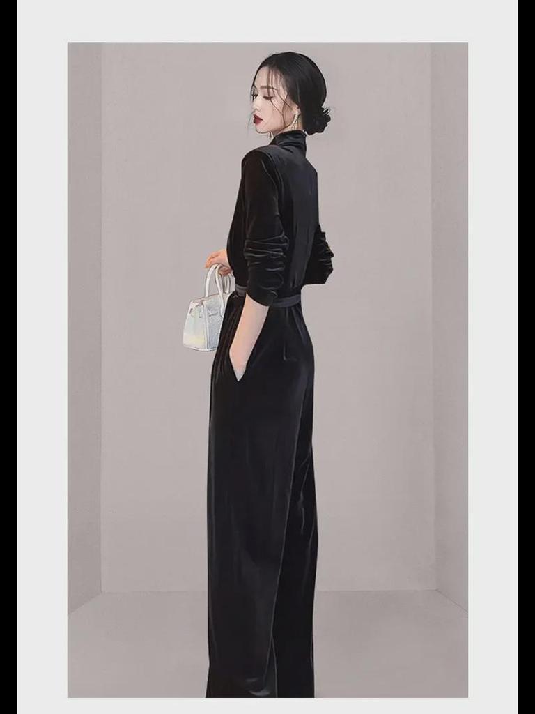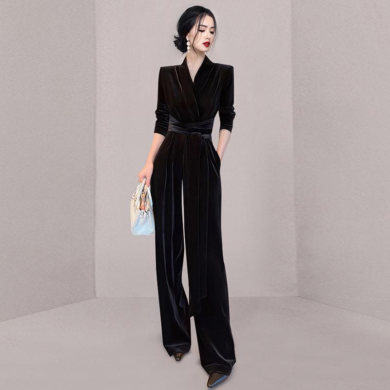 Европейский бархатный комбинезон с V-образным вырезом - новинка 2023 г.: Элегантная модель с высокой талией, длинными рукавами, бретелями и широкими штанинами.