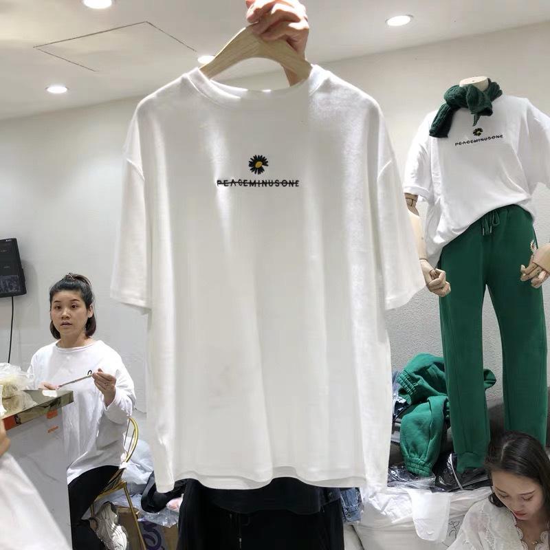 Футболка для женщин, новая летняя свободная корейская версия с вышитыми маленькими хризантемами, студенческий топ с короткими рукавами, женская одежда большого размера