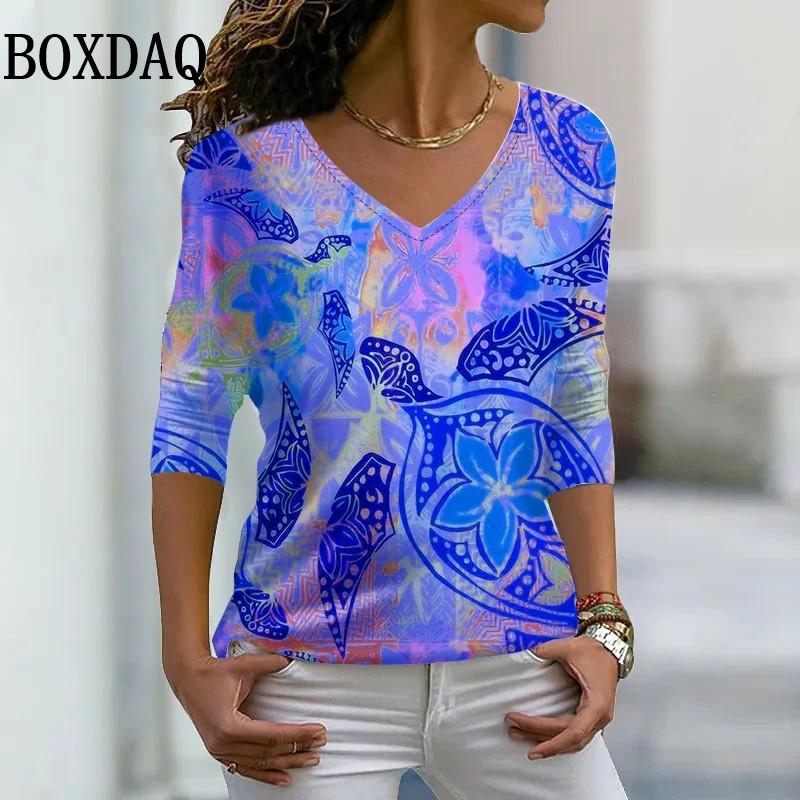 Новый весенний женский топ с V-образным вырезом 2025 модный дизайн с принтом живописью оверсайз футболка повседневная уличная с длинным рукавом одежда