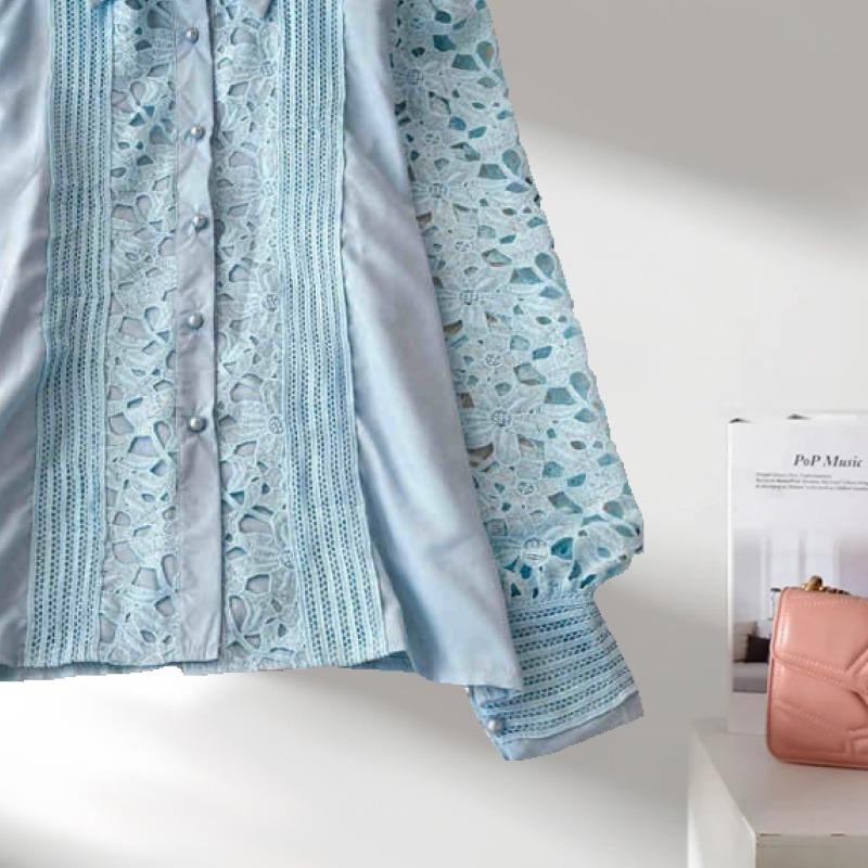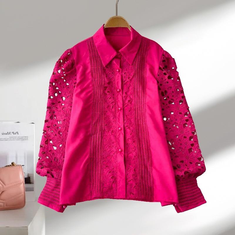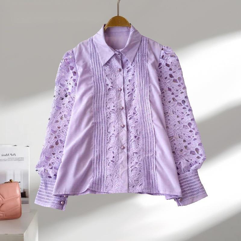 Винтажная мода ажурные вязаные крючком повседневные рубашки для женщин элегантные тонкие длинные рукава свободные женские блузки топы однотонные на пуговицах офисная женская рубашка 26448