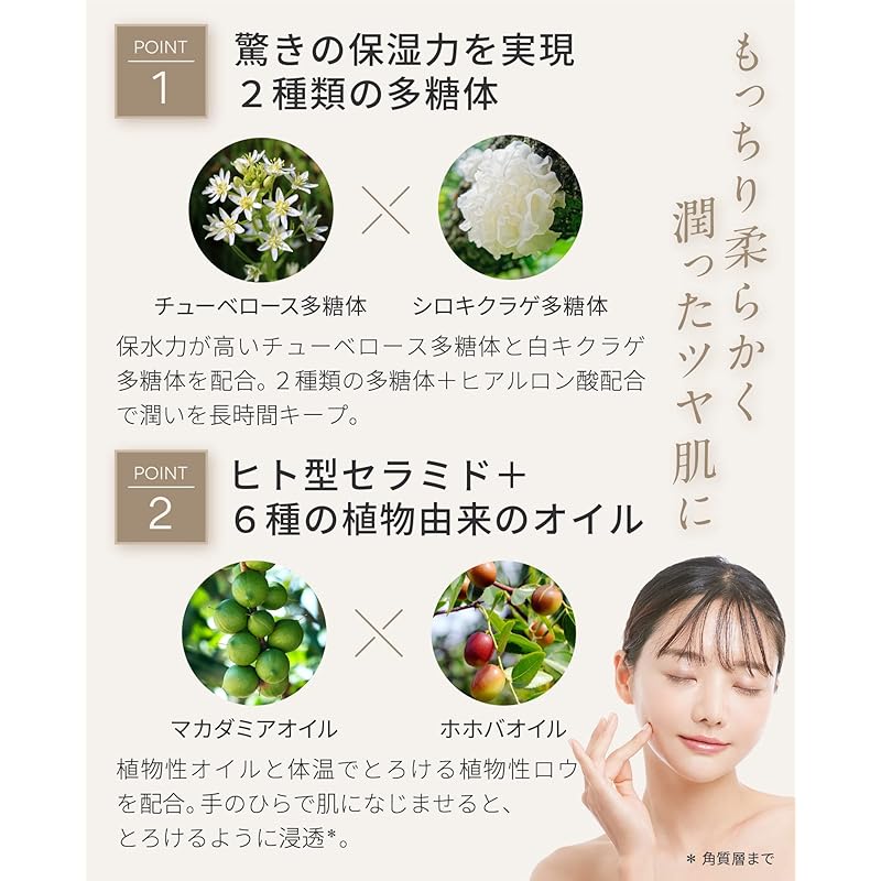 [Удивительная увлажняющая способность] Содержит два типа полисахаридов, которые, как говорят, обладают в 5–10 раз большей влагоудерживающей способностью, чем человеческий церамид и гиалуроновая кислота.. Обеспечивает невероятную увлажняющую способность благодаря богатой смеси растительных ингредиентов, включая масло жожоба и масло макадамии.
