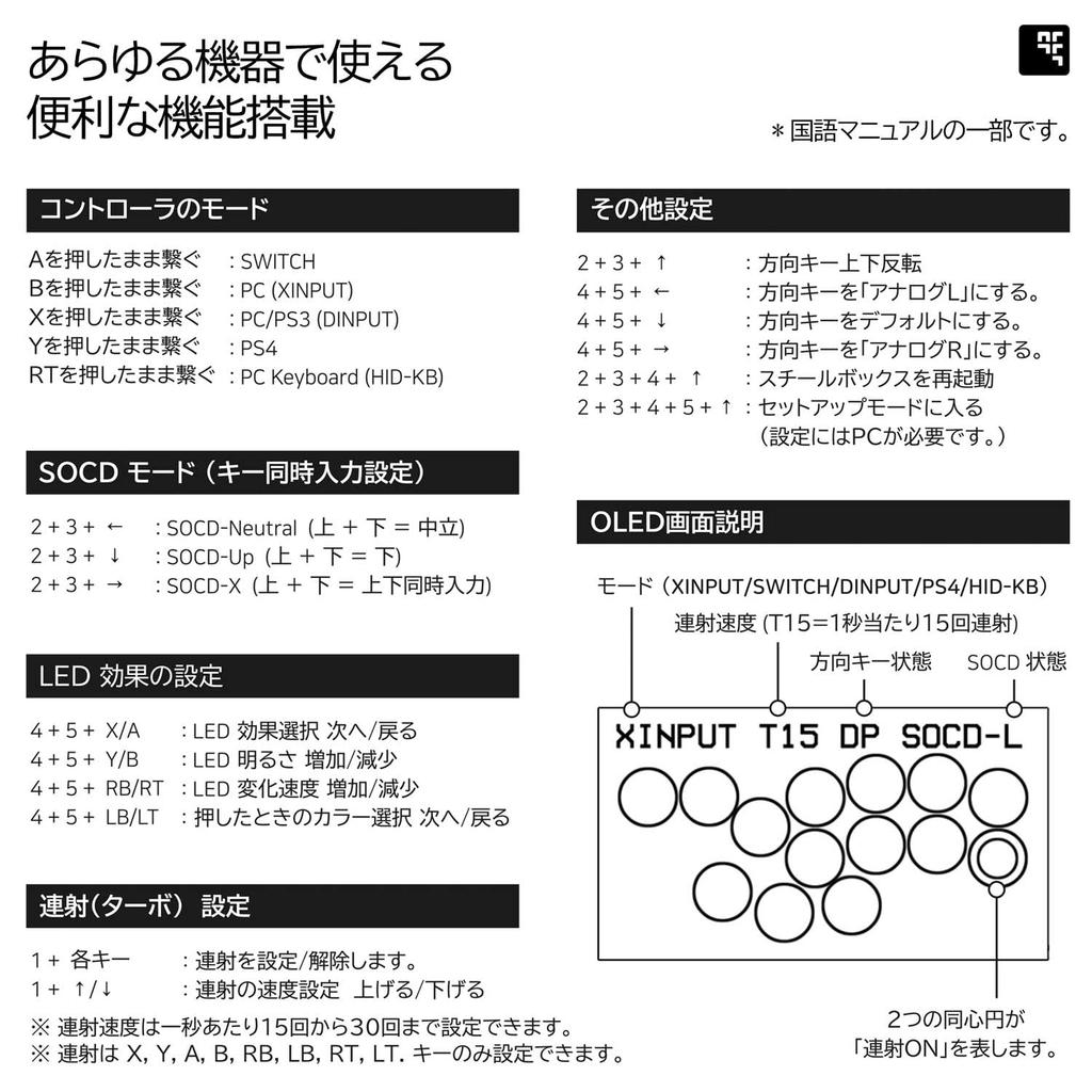 ✅ Особенность 2 - добавлены две кнопки, чтобы сделать его 10-кнопочным.. Макет соответствует стандартам CPT и может быть легко использован для музыкальных игр.. Подключившись к экрану настроек из браузера ПК, вы можете назначить любую кнопку. Вы можете легко переключать настройки SOCD с помощью комбинации кнопок, поэтому, если вы подключите его к SOCD-X и включите его в режим клавиатуры, вы сможете отлично использовать его в музыкальных играх.. *Заводская настройка — SOCD-N. Комбинации кнопок для переключения SOCD см. в руководстве на японском языке.
