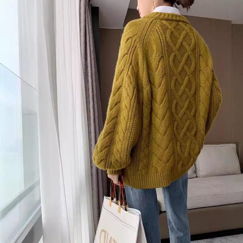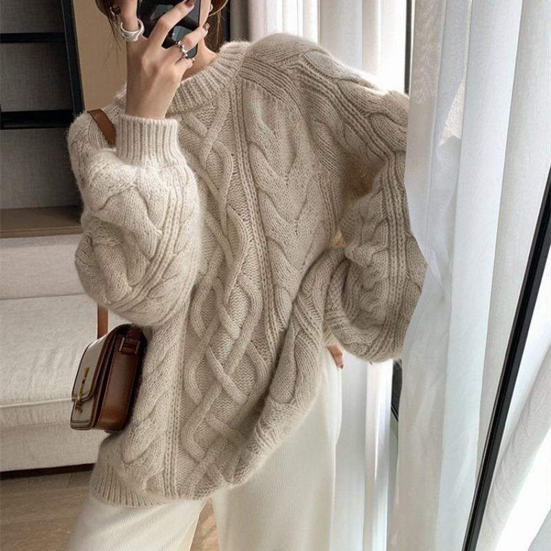 Осень Зима Пуловер крупной вязки Женский Свободный Ленивый Ветер Круглый вырез Утолщенный Свитер с косами Теплый Удобный Универсальный Верхняя одежда